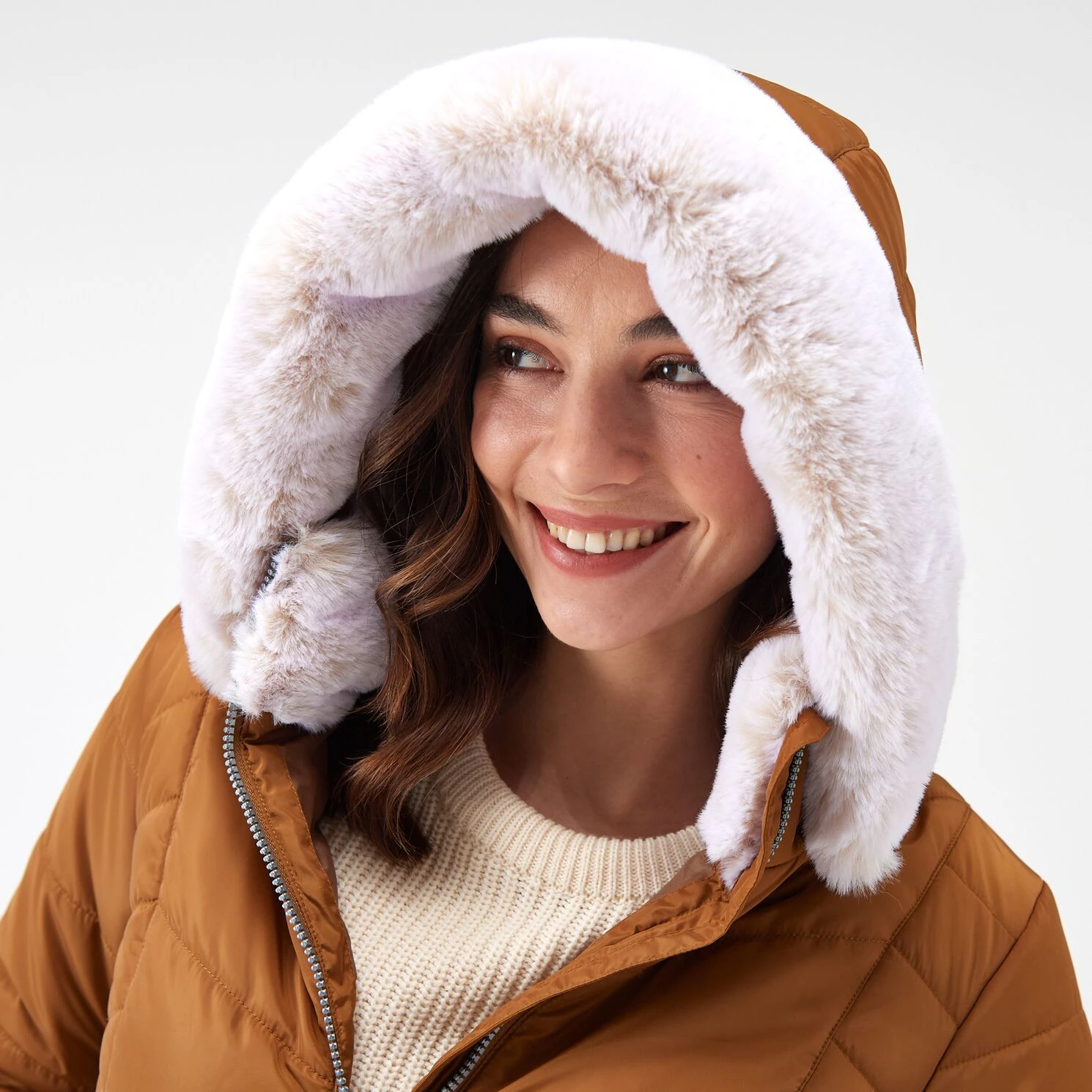 Die wattierte Kapuze der Steppjacke „Wildrose“ schützt Sie vor kaltem Wind und unerwartetem Nieselregen. Es verfügt über einen Kunstpelzbesatz, der Ihrem Winter-Outfit einen Hauch von Eleganz und Raffinesse verleiht. Dieser Kunstpelzbesatz ist nicht nur stilvoll, sondern auch frei von Tierquälerei, sodass Sie modisch bleiben und gleichzeitig den Tierschutz im Auge behalten können.