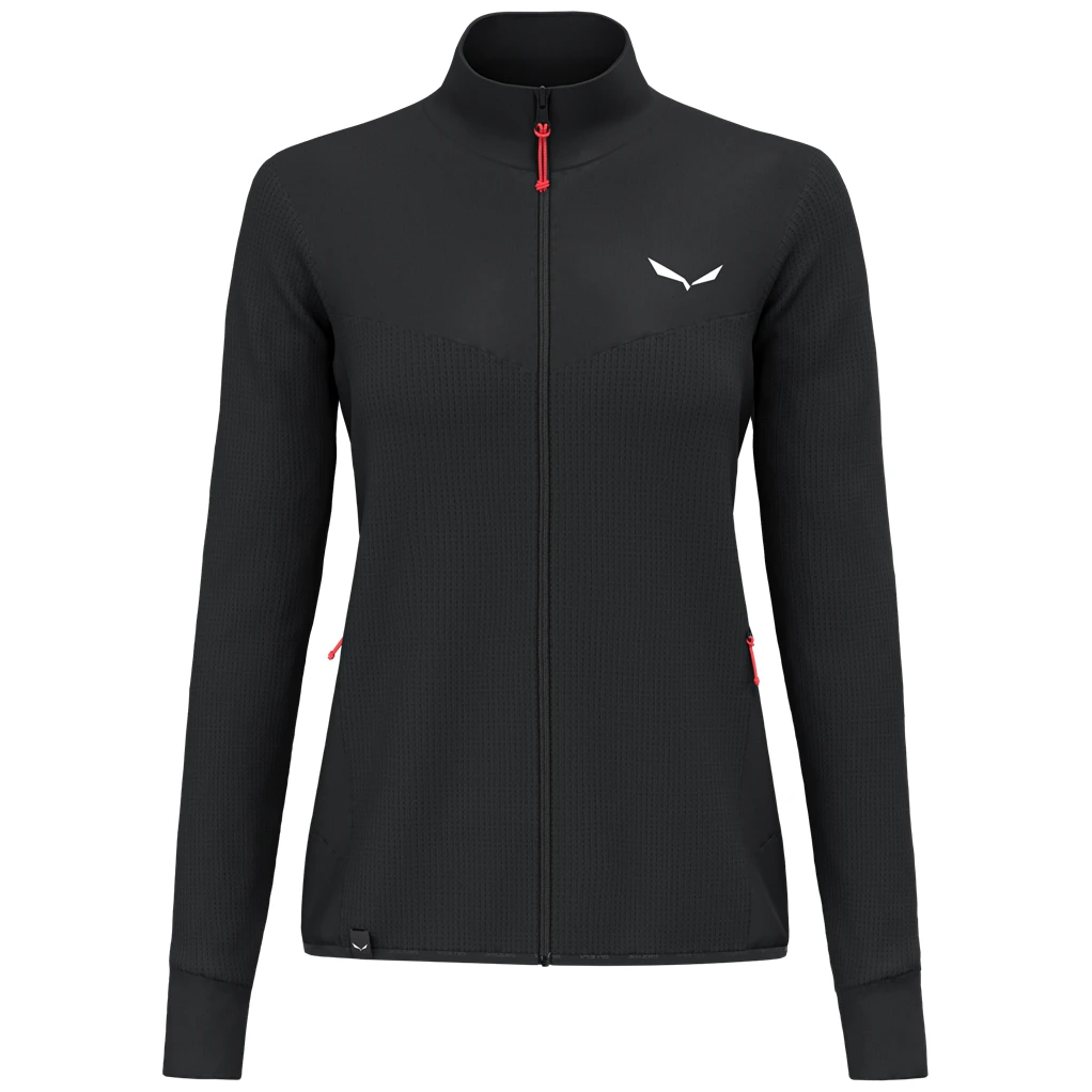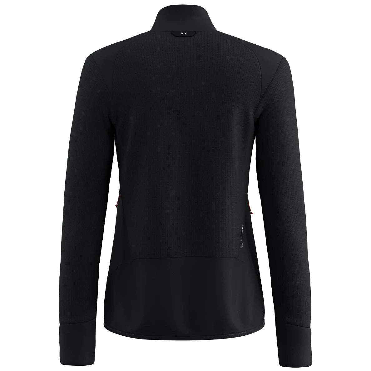 Das Damen Hybrid-Sweatshirt Puez Waffle Hyb Pl Jacket W von Salewa eignet sich hervorragend als zweite Schicht. Es ist verpackbar, trocknet schnell und leitet Schweiß gut ab.
