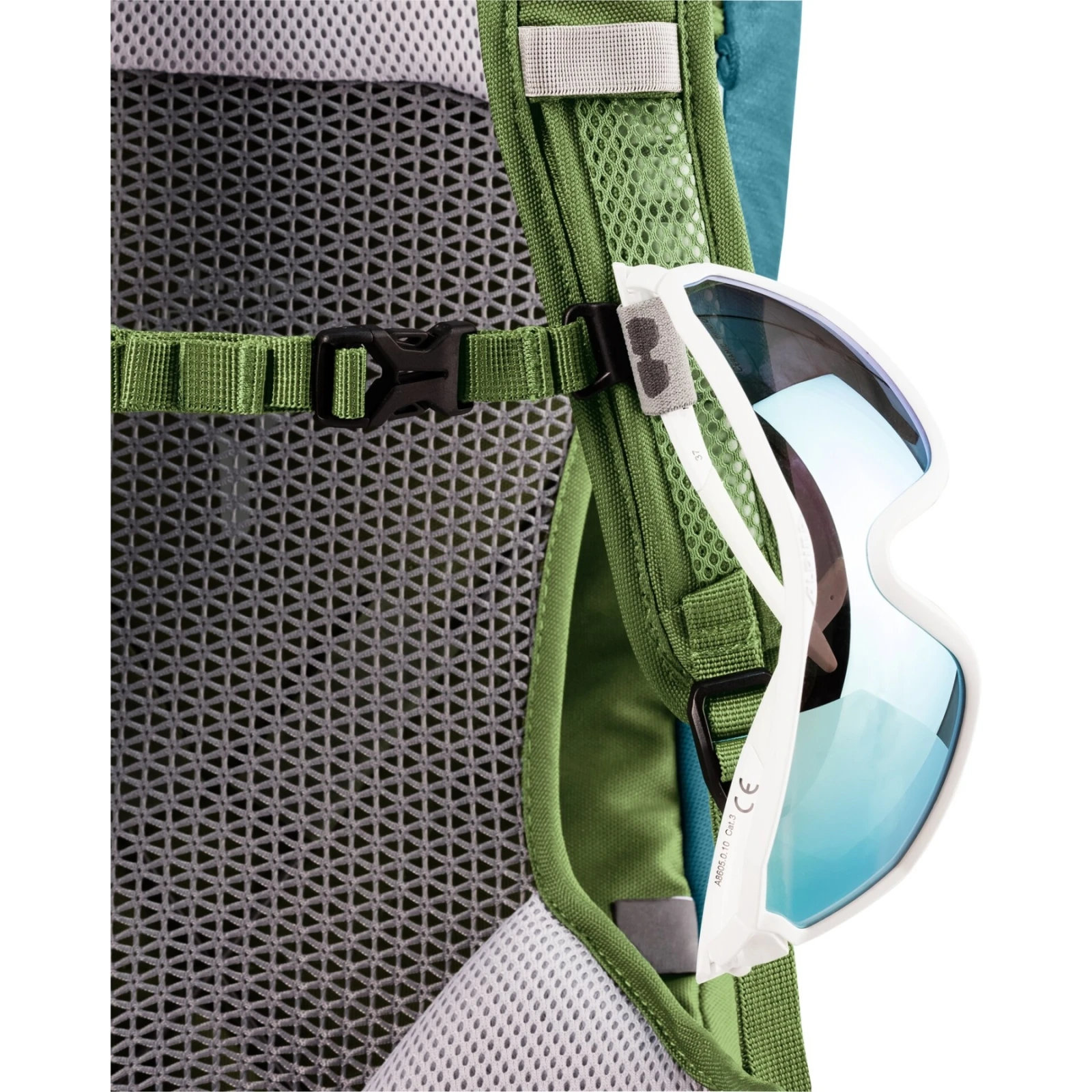 Der Rucksack besteht aus einer Kombination aus recyceltem Polyamid und leichtem gewebtem Polyestergarn, das reißfestist. Das verwendete Material ist umweltfreundlich und bluesign© zertifiziert. Der Rucksack bietet einen verstärkten Boden, eine Sonnenbrillenschlaufe am linken Schultergurt und eine Regenhülle für den Rucksack. Der Rucksack verfügt über ausreichend Stauraum – eine elastische Seitentasche, eine Tasche für eine 2-Liter-Trinkblase und eine Wertsachentasche mit Schlüsselring.