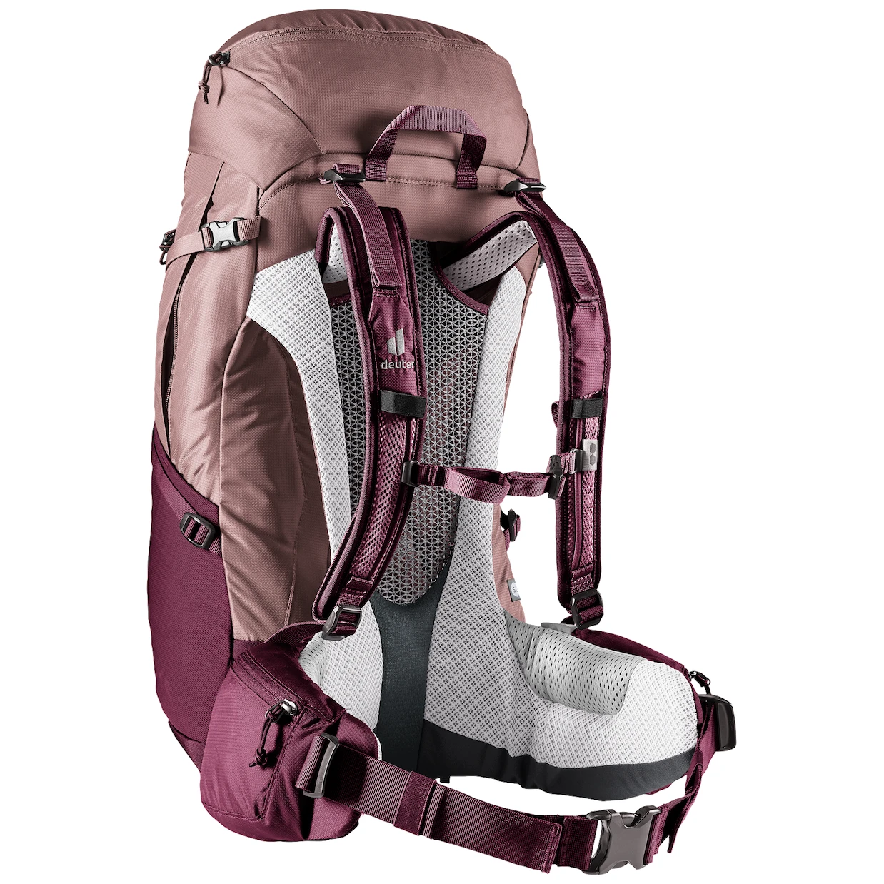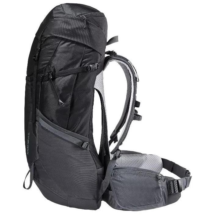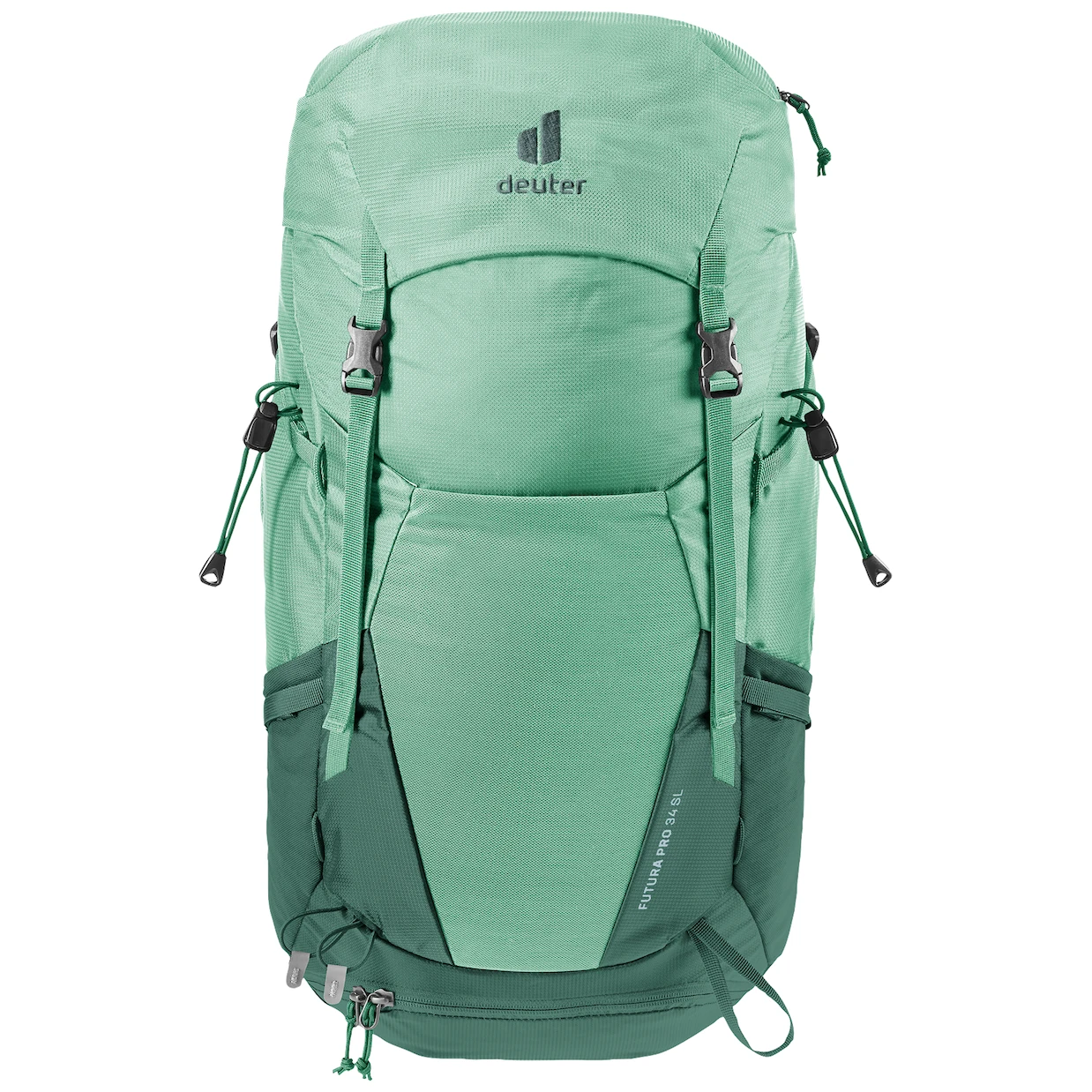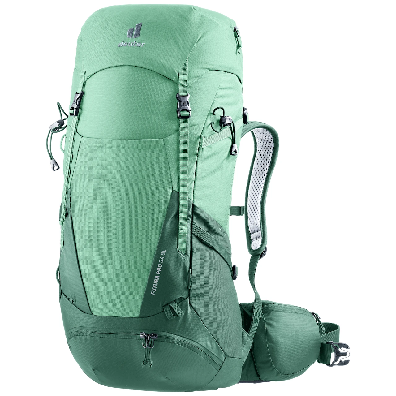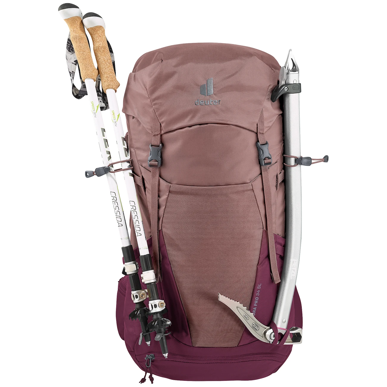 Der Damen Wanderrucksack Futura Pro 34 SL der Marke Deuter ist speziell für Frauen gefertigt und passt sich optimal ihrer Anatomie an. Der Rucksack besteht aus Recyclingmaterial mit leichtem Polyestergarn, das so stark ist, dass es nicht reißt. Der Rucksack verfügt daher über ein ergonomisches Mesh-Aircomfort-Sensic-Pro-Rückensystem, das eine maximale Rückenbelüftung gewährleistet. Der bewegliche VariFlex ECL Hüftgurt mit ergonomischen Polstereinsätzen ermöglicht zudem ein kraftsparendes Tragen.
