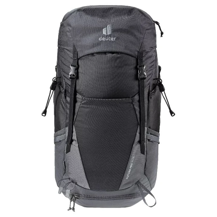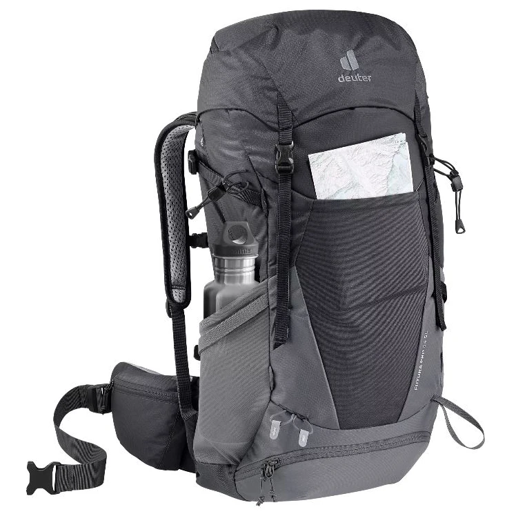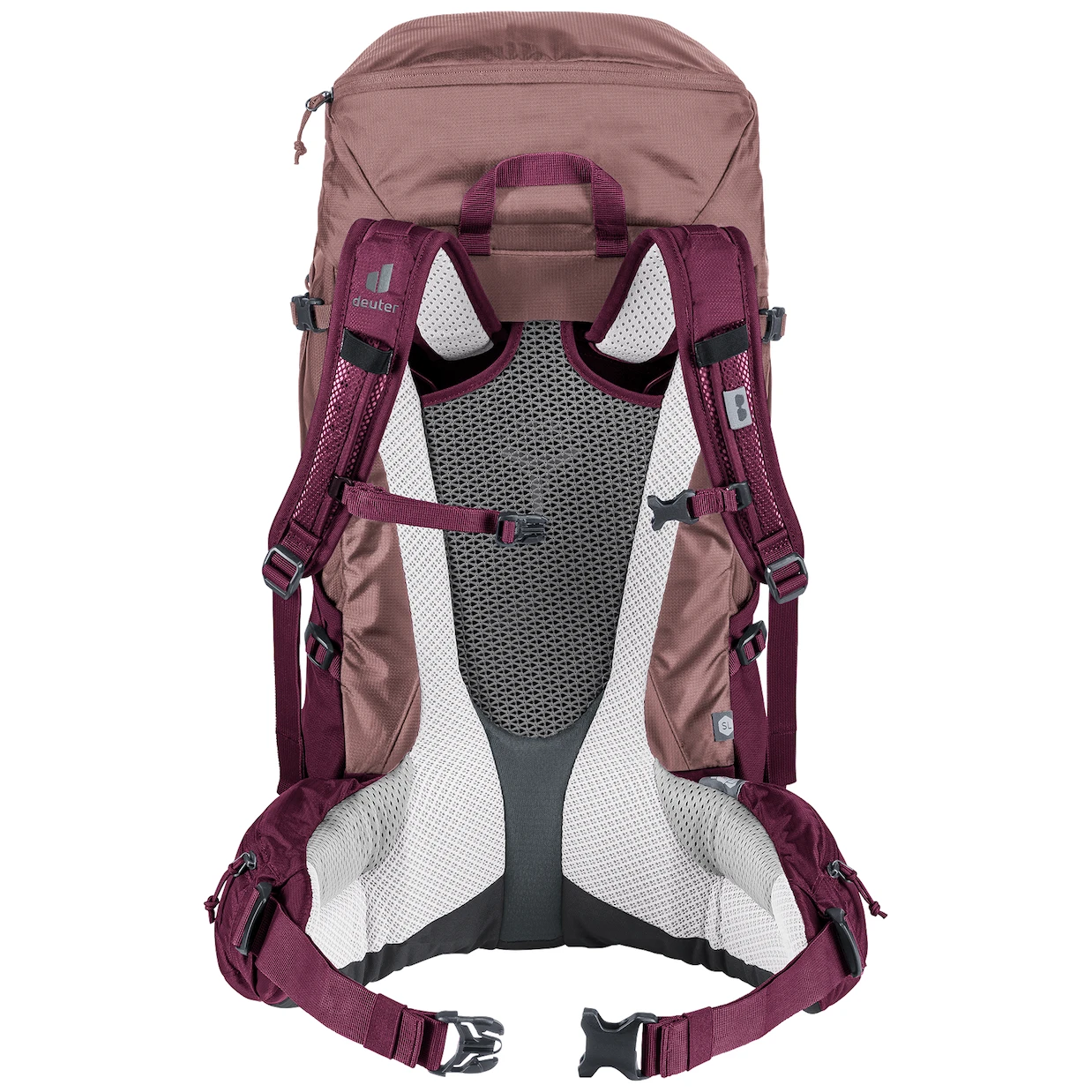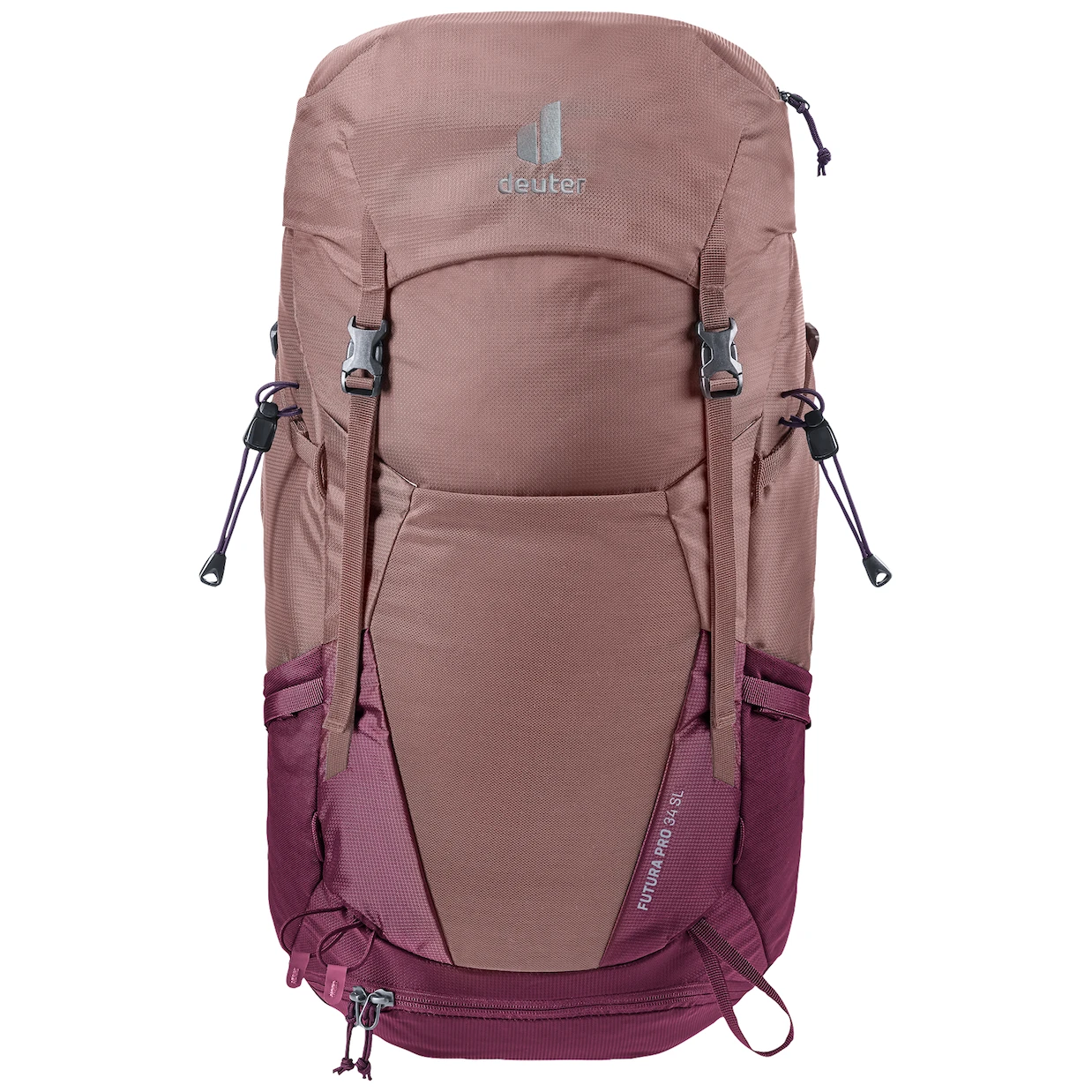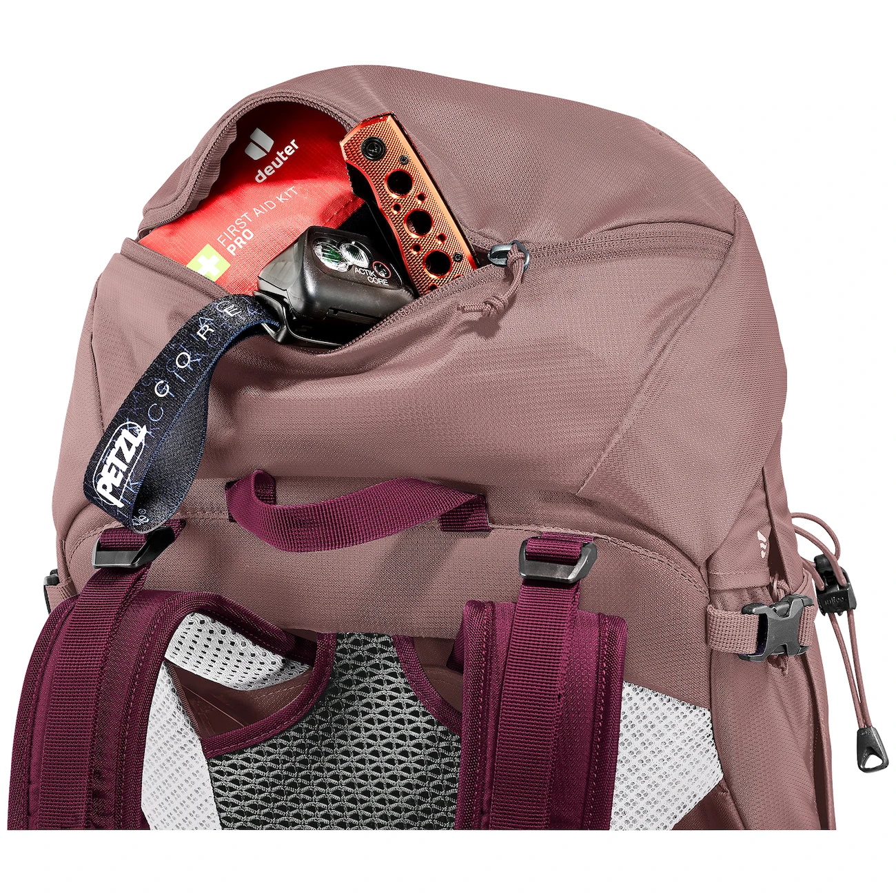 Der Damen Wanderrucksack Futura Pro 34 SL der Marke Deuter ist speziell für Frauen gefertigt und passt sich optimal ihrer Anatomie an. Der Rucksack besteht aus Recyclingmaterial mit leichtem Polyestergarn, das so stark ist, dass es nicht reißt. Der Rucksack verfügt daher über ein ergonomisches Mesh-Aircomfort-Sensic-Pro-Rückensystem, das eine maximale Rückenbelüftung gewährleistet. Der bewegliche VariFlex ECL Hüftgurt mit ergonomischen Polstereinsätzen ermöglicht zudem ein kraftsparendes Tragen.