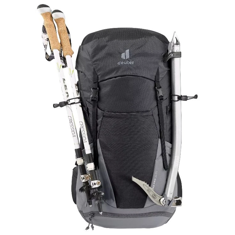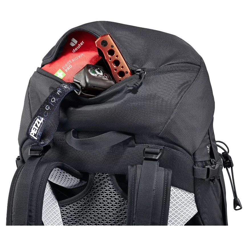 Der Rucksack bietet außerdem ein SOS-Label, eine Halterung für Wanderstöcke, eine Befestigung für Eispickel, eine Regenhülle und Befestigungsschlaufen für eine Helmhalterung.