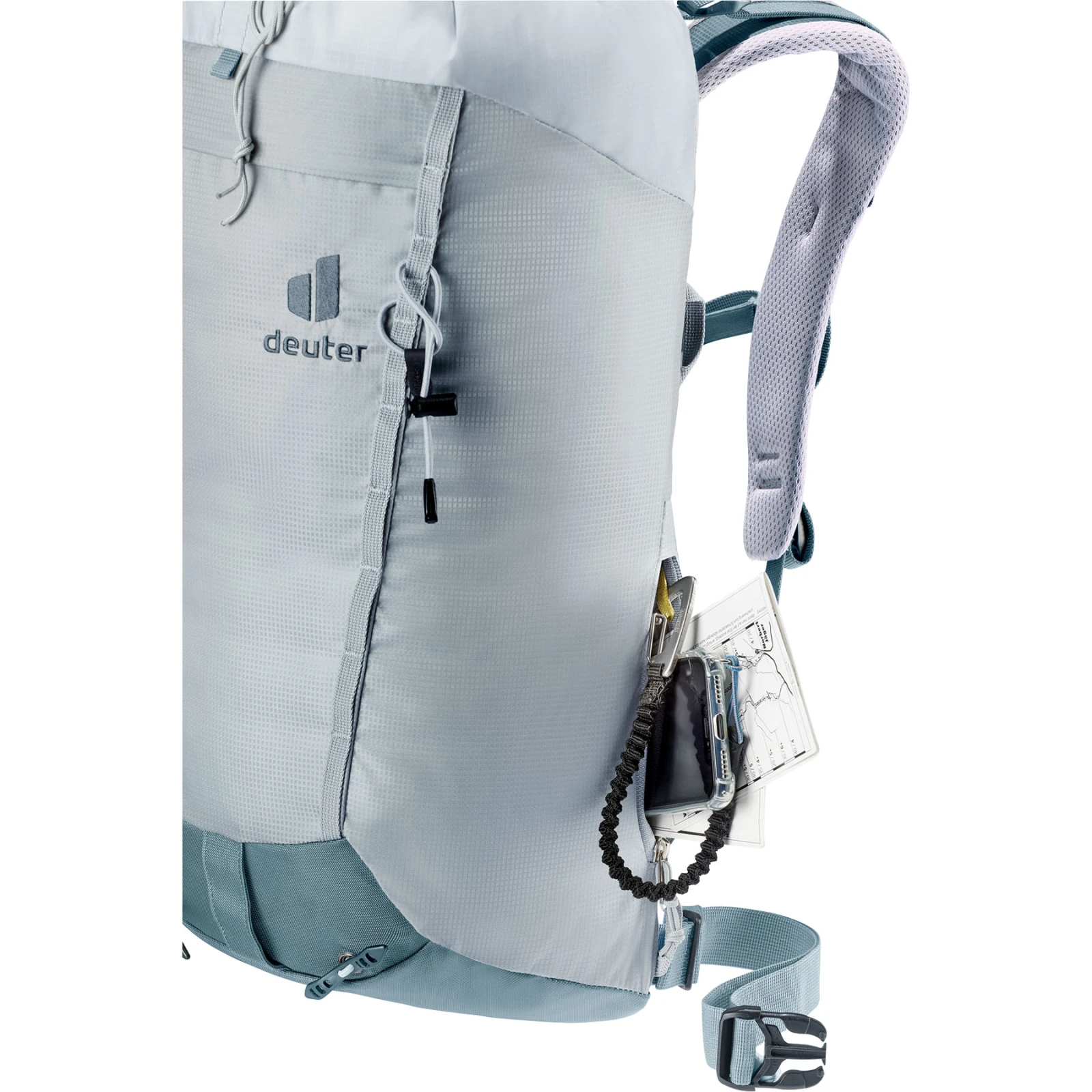 Der Guide Lite 22 SL Damen-Funktionsrucksack von Deuter ist mit kürzerer Rückenpartie und schmaleren Schultergurten auf die weibliche Anatomie abgestimmt. Der Rucksack besteht aus Polyamidgewebe, wodurch eine enorme Gewichtsreduzierungmöglich war. Das Material weist eine dichte Struktur auf, wodurch der Stoff reißfest ist. Das Alpine-System mit U-förmiger Rückenverstärkung sorgt für Komfort und optimale Gewichtsverteilung. Für zusätzlichen Komfort sorgen geformte und gepolsterte Schultern, ein abnehmbarer Hüftgurt, Kompressionsriemen und ein verstellbarer Brustgurt mit Pfeife zur sicheren Positionierung.