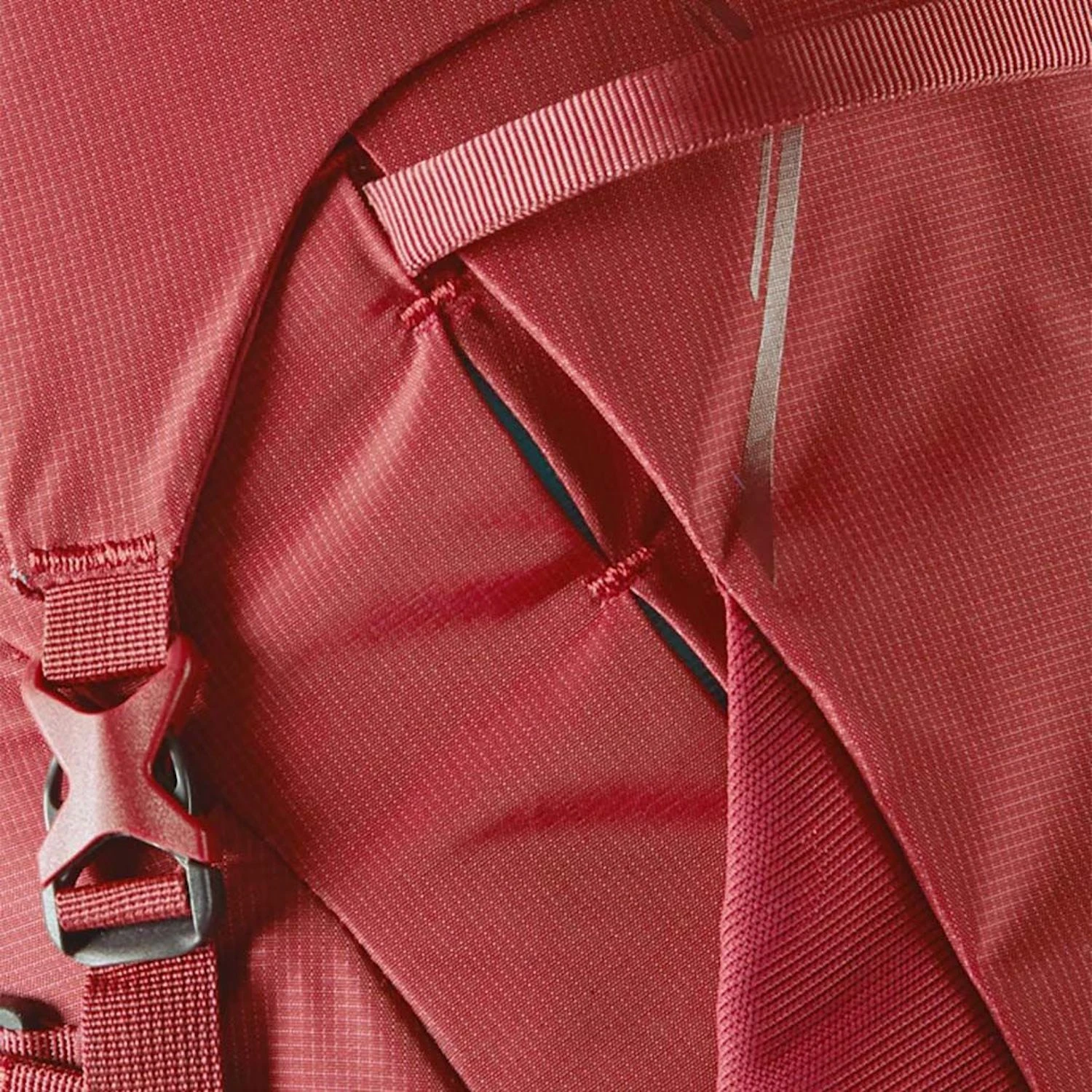 Der obere Teil des Rucksacks besteht aus 210D Mini Ripstop-Gewebe, das die Haltbarkeit des Rucksacks erhöht, aber auch leicht und atmungsaktiv ist. Der Rucksack verfügt über einen Brustgurt mit Pfeife, eine Sicherheitstasche im Deckel, eine Tasche außen am Deckel, eine versteckte Fronttasche, 2 seitliche Netztaschen und 2 Reißverschlusstaschen am Hüftgurt. Außerdem besteht die Möglichkeit, Trekkingstöcke, Eispickel oder andere Lasten am Rucksack zu befestigen. Im Inneren des Rucksacks gibt es eine Vorbereitung für eine Trinkblase und außerdem einen integrierten Regenmantel.