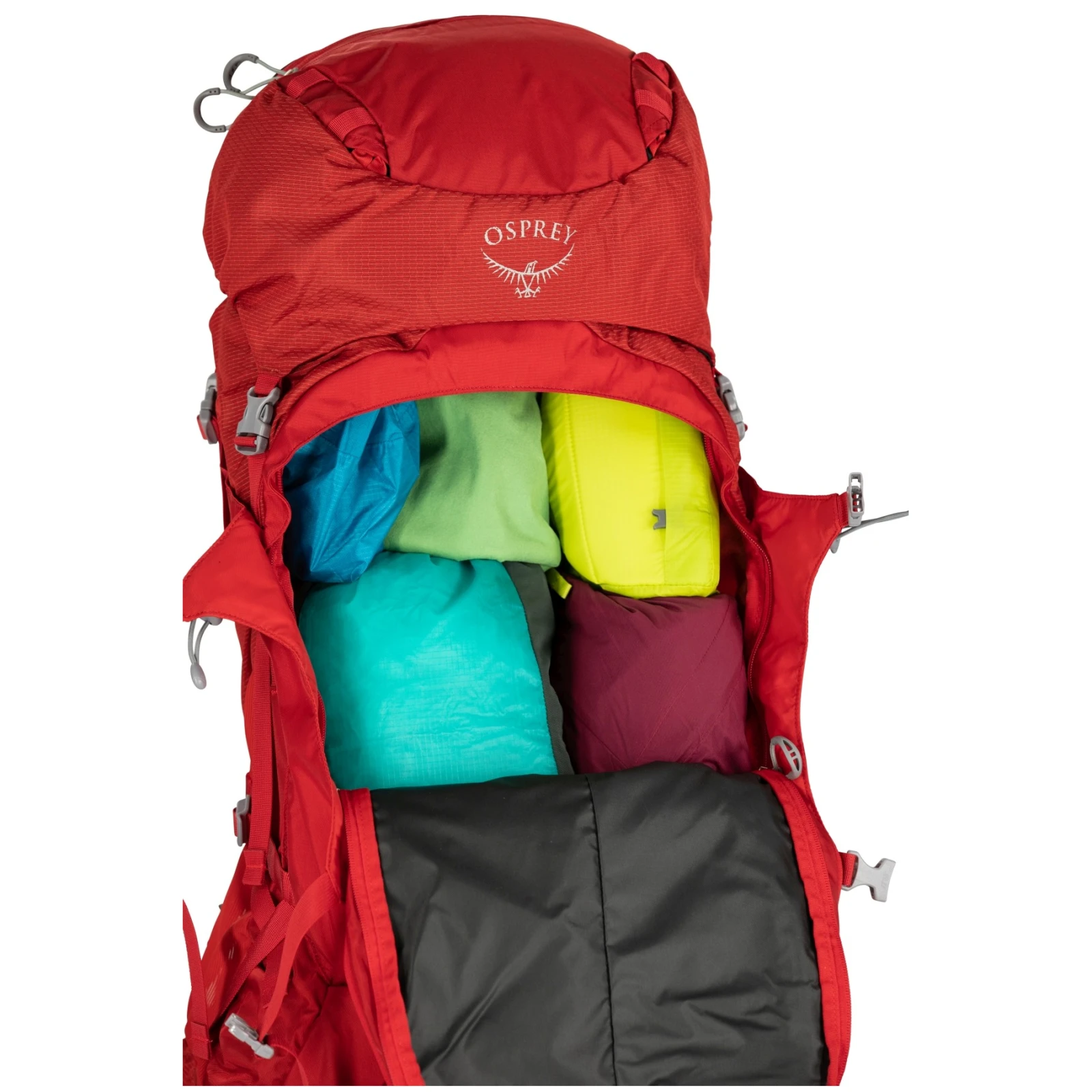 Der Rucksack hat drei Eingänge – den oberen durch das Dach, den vertikalen Reißverschluss vorne und den Reißverschluss unten. So haben Sie alles immer übersichtlich zur Hand. Innen ist es in zwei Kammern unterteilbar. Das untere Fach kann beispielsweise für einen Schlafsack genutzt werden. Außerdem gibt es einen abnehmbaren Regenmantel und eine Tasche für die Trinkblase. Der gesamte Rucksack kann mit StraightJacket-Kompressionsriemen heruntergezogen werden.