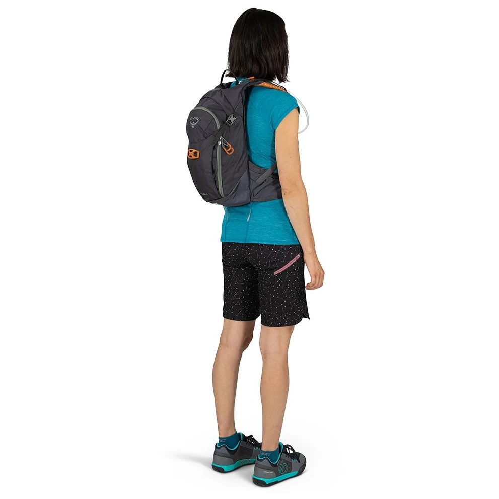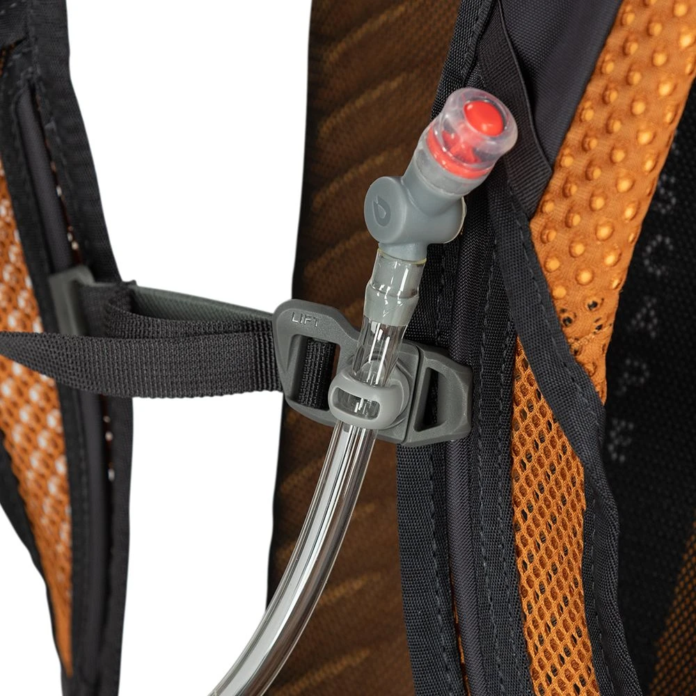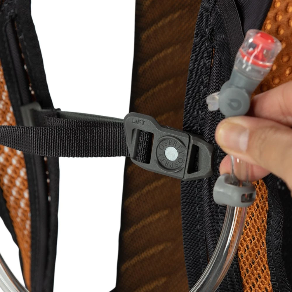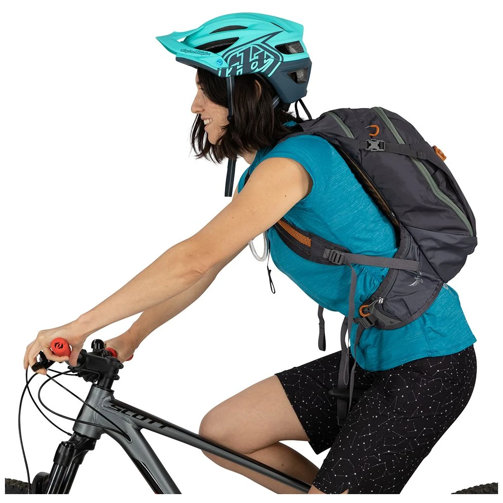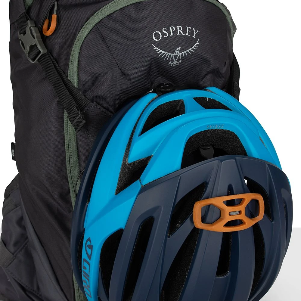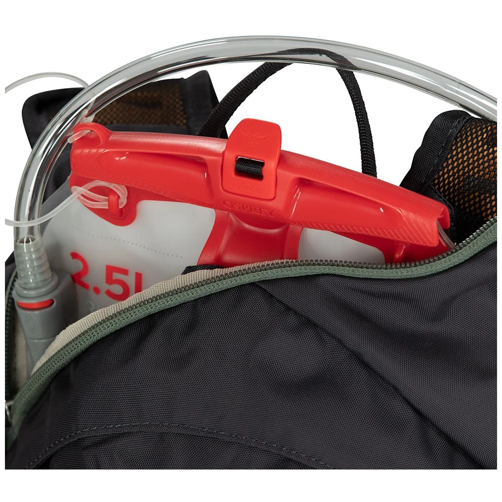 Der Rucksack bietet außerdem die Möglichkeit zur Befestigung an einem LidLock-Helm oder zum Tragen eines Integralhelms mit Kompressionsriemen, einer Blinkerbefestigung, einer magnetischen Befestigung des Brustgurt-Beißventils, einem direkten Reißverschlusszugang zum Reservoirfach und einer Werkzeugorganisation in der Hauptkammer. Stauraum bieten eine Stofftasche auf der Vorderseite, eine Hüftgurttasche mit Reißverschluss, eine kratzfeste Reißverschlusstasche mit heißgeprägtem Schlitz und ein vorbereiteter Platz für eine Osprey Hydraulics™ LT 2,5-l-Trinkflasche (separat erhältlich).