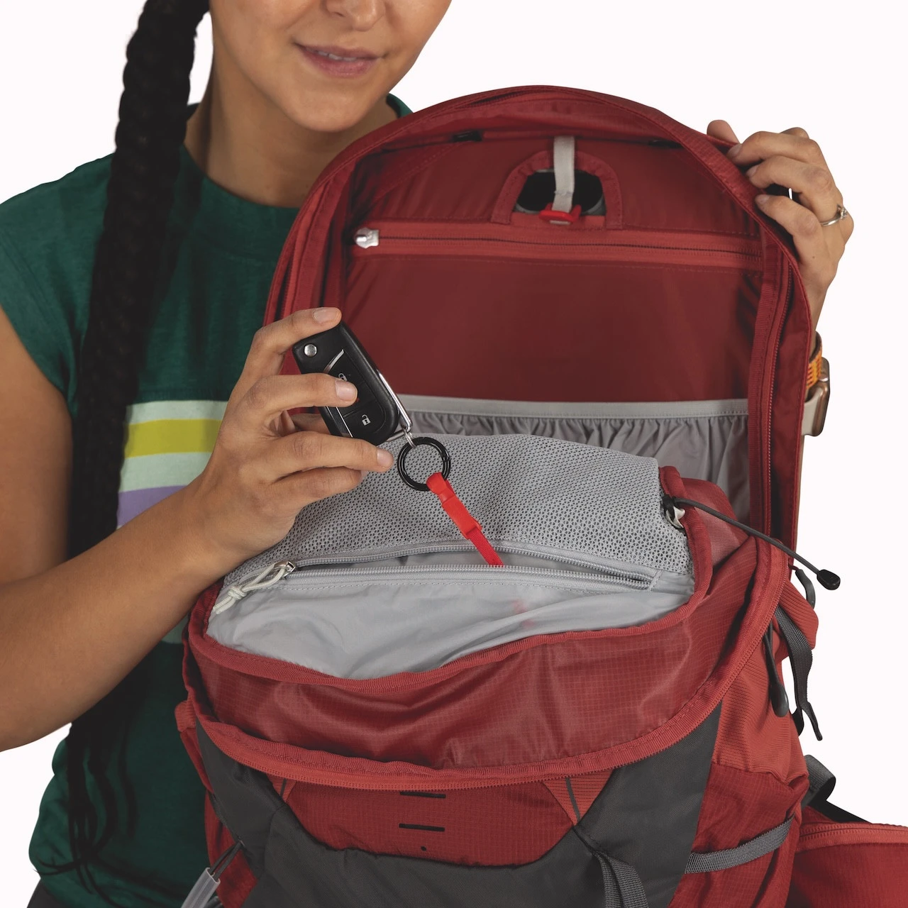 - Reißverschlusstasche oben, Reißverschlusstasche aus Mesh mit Schlüsselclip innen, elastische Vordertasche, elastische Seitentaschen und zwei Hüftgurttaschen helfen dabei, Ordnung zu halten