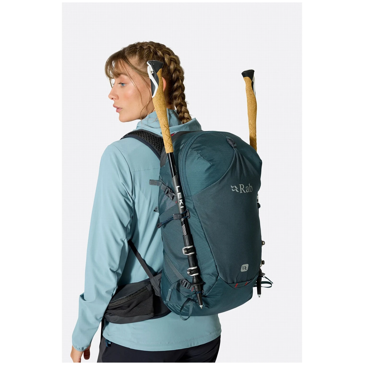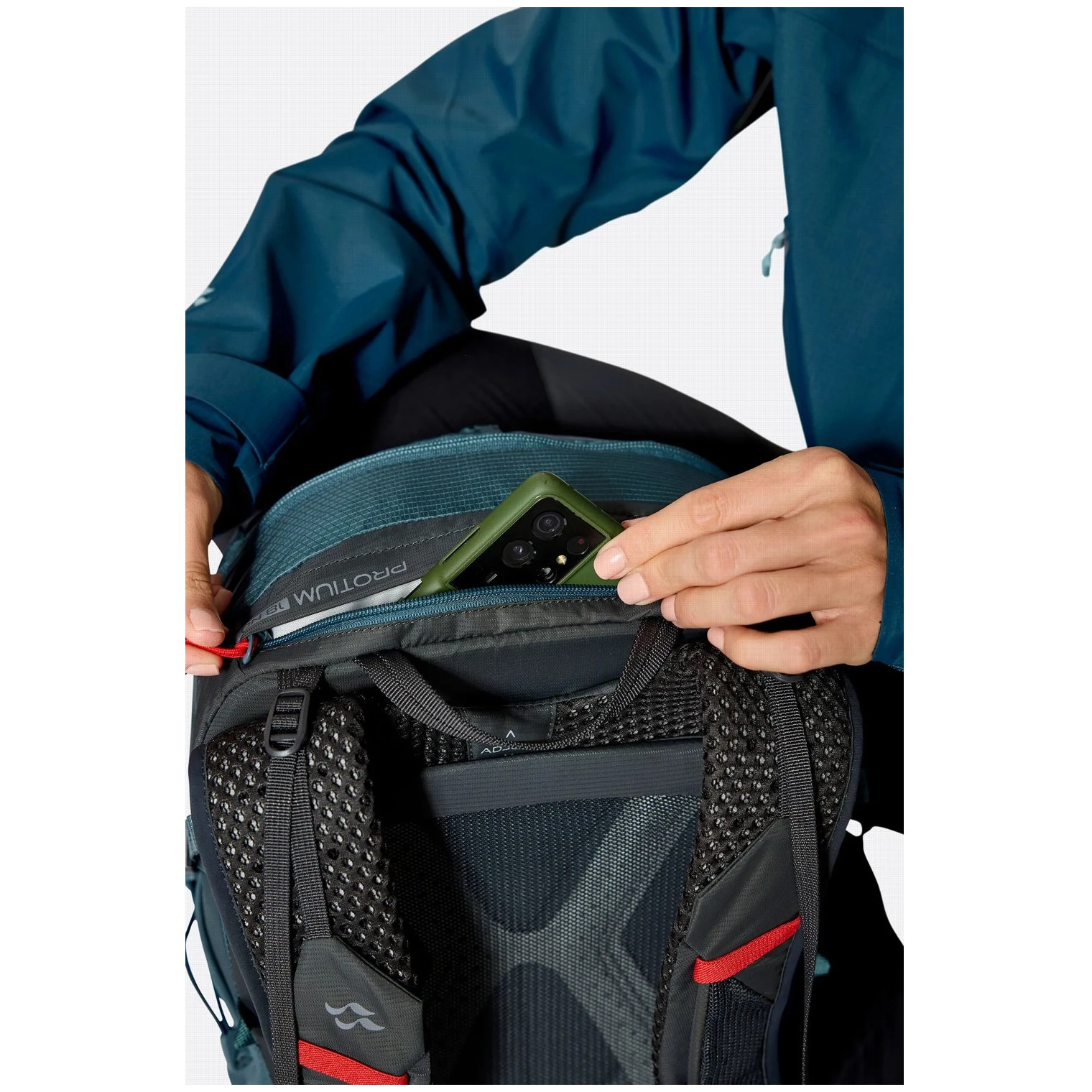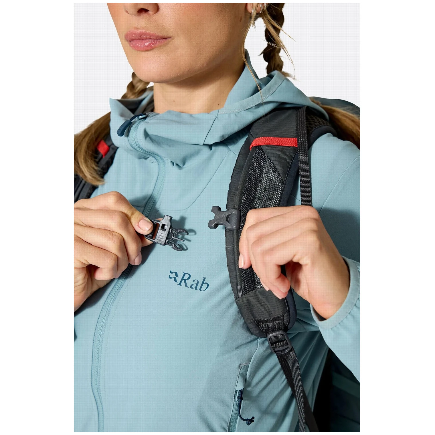Der Damen-Rucksack Protium 18 ND der Marke Rab ist für ganztägige All-Mountain-Wanderungen in jedem Gelände konzipiert. Für maximalen Tragekomfort sorgt das elastische und flexible Rückensystem Air Contour™, das selbst bei intensiven Anstiegen für eine optimale Luftzirkulation sorgt. Die atmungsaktiven und verstellbaren Schultergurte und der Hüftgurt tragen zusätzlich zum hohen Tragekomfort bei.
