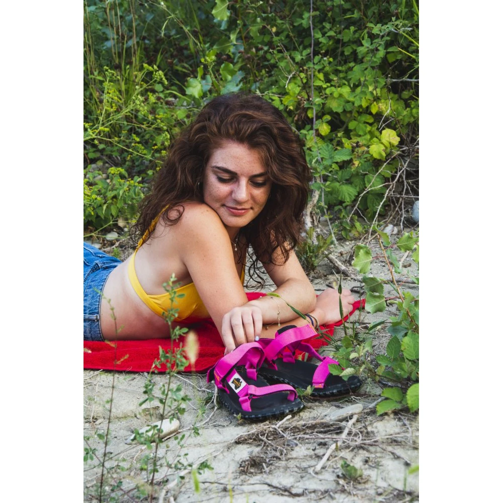 Damensandalen der Marke Gumbies , entwickelt mit dem Fokus auf noch mehr Komfort bei langen Spaziergängen, respektieren die Anatomie des Fußes. Wir bieten Ihnen eine Kombination aus der bewährten anatomischen Sohle aus recycelten Materialien und Jute mit einem neu entwickelten komfortableren Obermaterial.