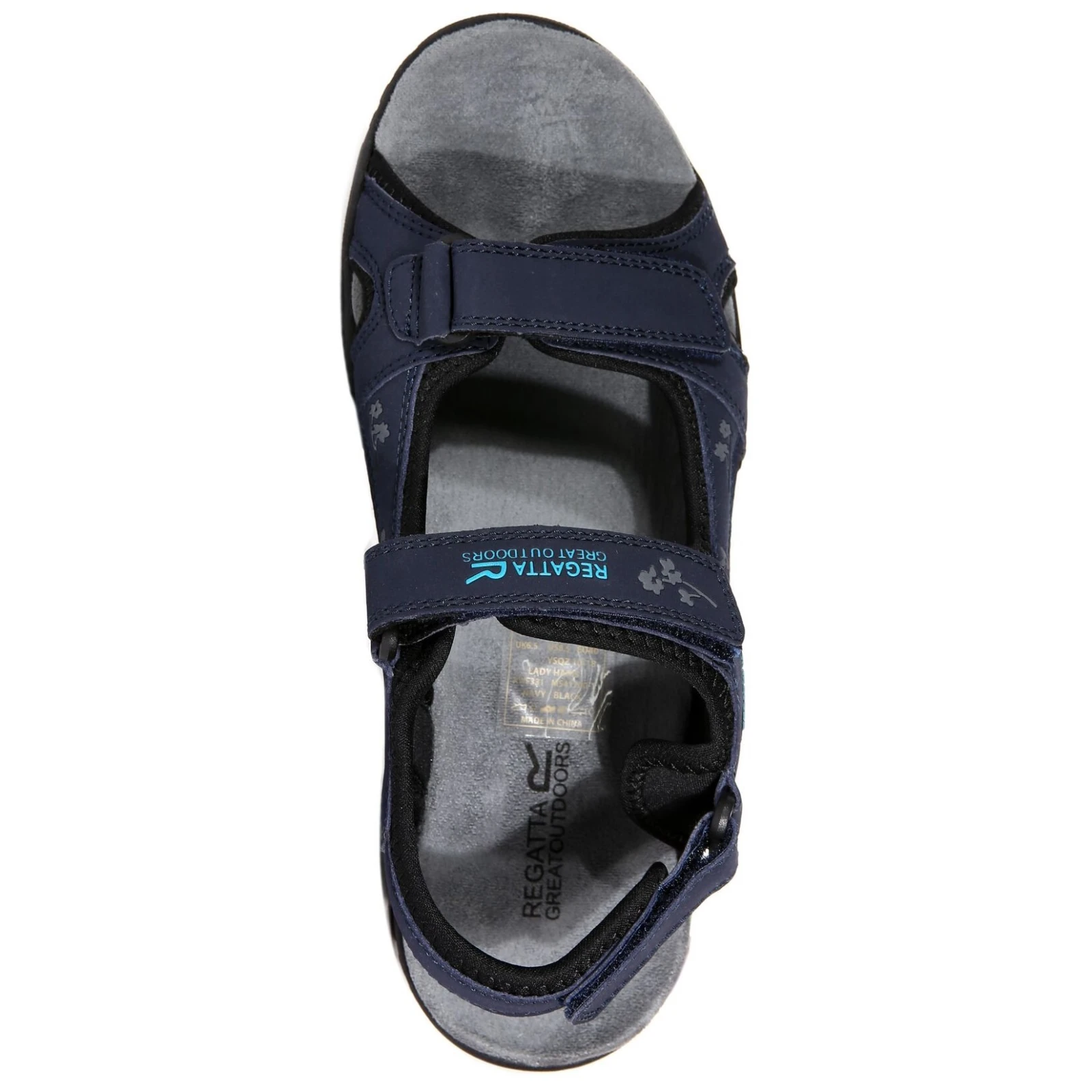 Damensandalen Lady Haris von Regatta mit flachem Absatz. Die Riemen sind für mehr Tragekomfort auf der Rückseite mit Elasthan gefüttert, das Obermaterial besteht aus Kunstlederund sie sind durch Klettverschlüsseverstellbar, davon zwei über dem Rist und einer über der Ferse, was für einen optimalen Sitz des Schuhs sorgt. Der hintere Riemen ist gepolstert und der Spann ist für mehr Stabilität geformt. Die Innensohle aus EVA -Material ist weich, dämpft Stöße und nimmt kein Wasser auf. Die leichte TPR -Sohle ist sehr langlebig und hat eine rutschfeste Oberfläche.