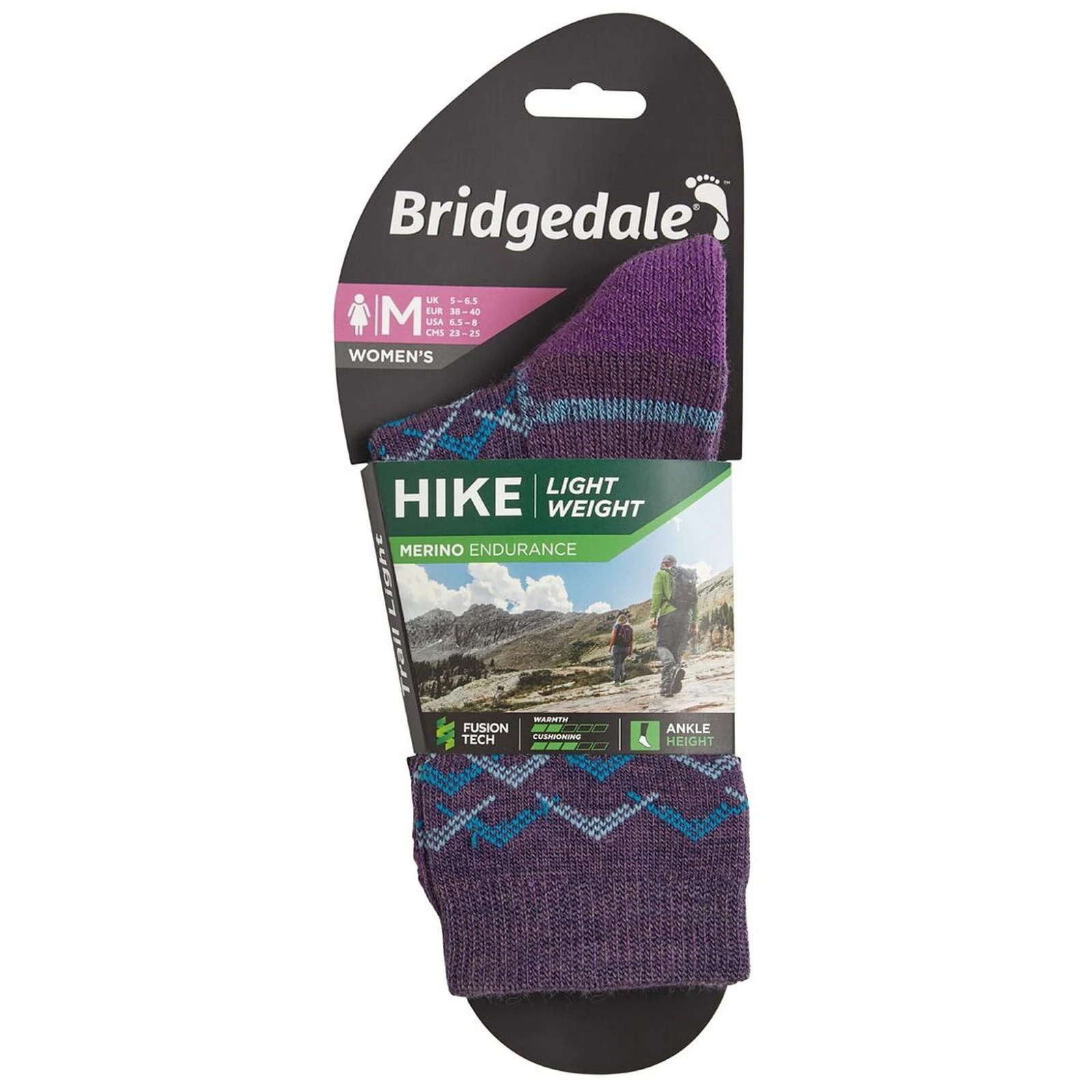 Damen- Socken Hike Lightweight Merino Performance Ankle Women's sind leichte Frühlings- und Sommersocken des renommierten britischen Herstellers Bridgedale und ersetzen das Modell WoolFusion Trail. Durch seine Verarbeitung eignet er sich besonders für ganztägige Frühlings- und Sommerwanderungen bei wärmerem Wetter.