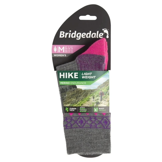 Die Damen- Socken Hike Lightweight Merino Performance Boot sind leichte Frühlings- und Sommersocken des renommierten britischen Herstellers Bridgedale und ersetzen das Modell WoolFusion Trail. Durch seine Verarbeitung eignet er sich besonders für ganztägige Frühlings- und Sommerwanderungen bei wärmerem Wetter. Die Höhe der Stiefelsocken ist für leichtere Wanderschuhegeeignet.