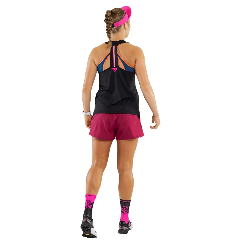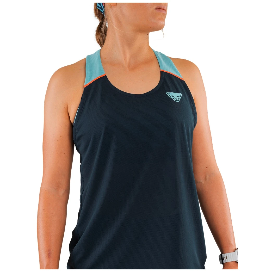 Das Damen Sport-Tanktop Sky Tank W Dynafit aus recycelten Materialien bietet schnelles Trocknen, guten Feuchtigkeitstransport, flache Nähte, reflektierende Elemente und eine Polygiene Anti-Geruchs-Behandlung.