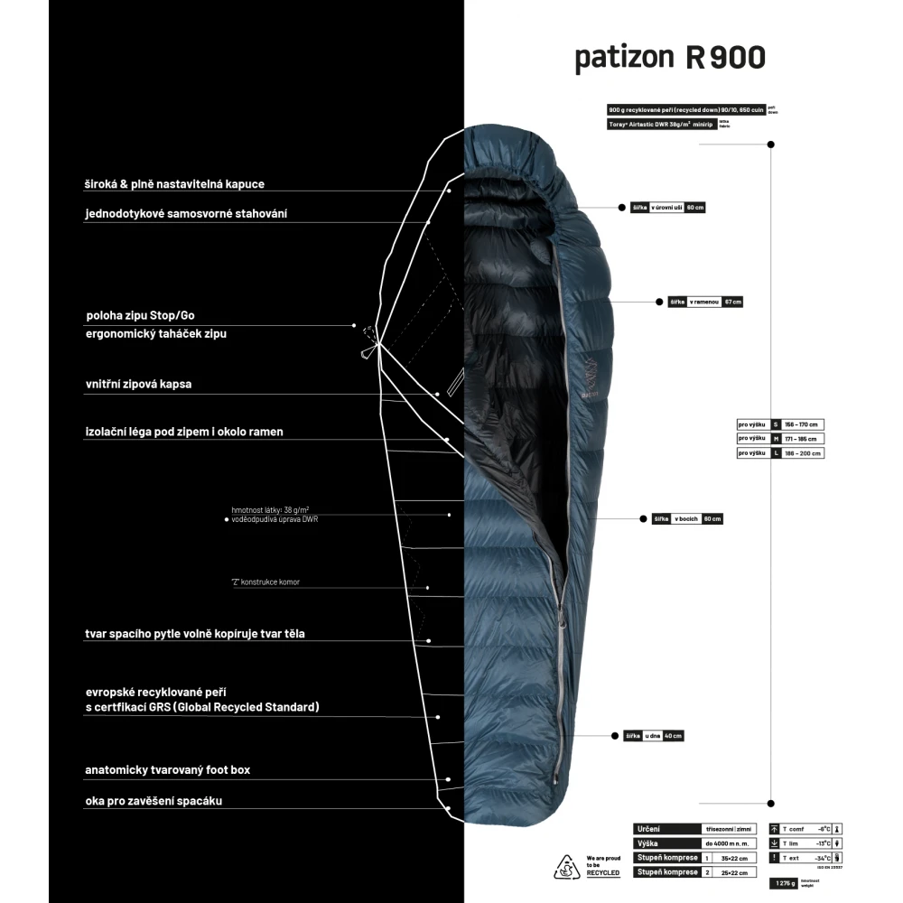 Zu den weiteren Vorteilen des Schlafsacks gehören eine abnehmbare und anatomisch geformte Kapuze, ein angenehm weiter Schnitt, eine Reißverschlusstasche innen und ein halbautomatischer SHZ-Reißverschluss mit isolierter Klappe, der zu 100 % aus recycelten Materialien besteht. Schlafsäcke der R-Serie werden in der Tschechischen Republik hergestellt.