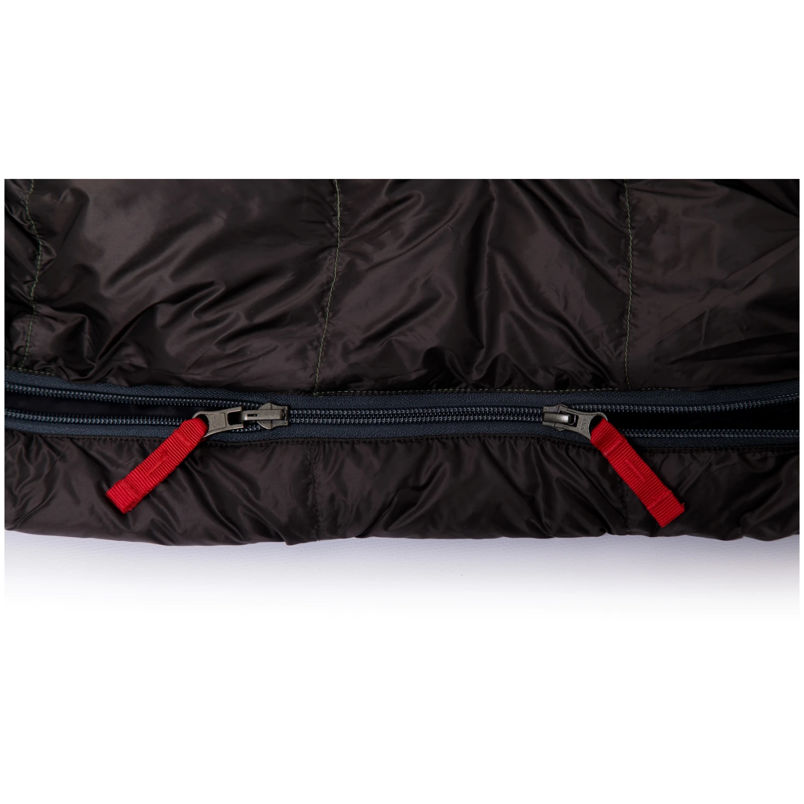 Er ist mit YKK -Reißverschlüssen mit zwei gegenüberliegenden Schienen ausgestattet, die den Einstieg in den Schlafsack erleichtern und gleichzeitig für Belüftung beim Schlafen in wärmeren Temperaturen sorgen. Durch die Teilung der Reißverschlüsse auf der rechten oder linken Seite des Schlafsacks ist es möglich, zwei Schlafsäcke miteinander zu verbinden. Im Lieferumfang ist standardmäßig ein größerer Aufbewahrungsbeutel für die Zeit enthalten, in der Sie den Schlafsack nicht verwenden.