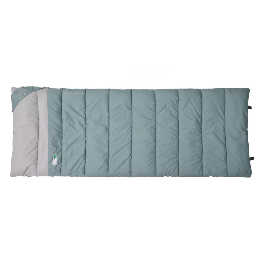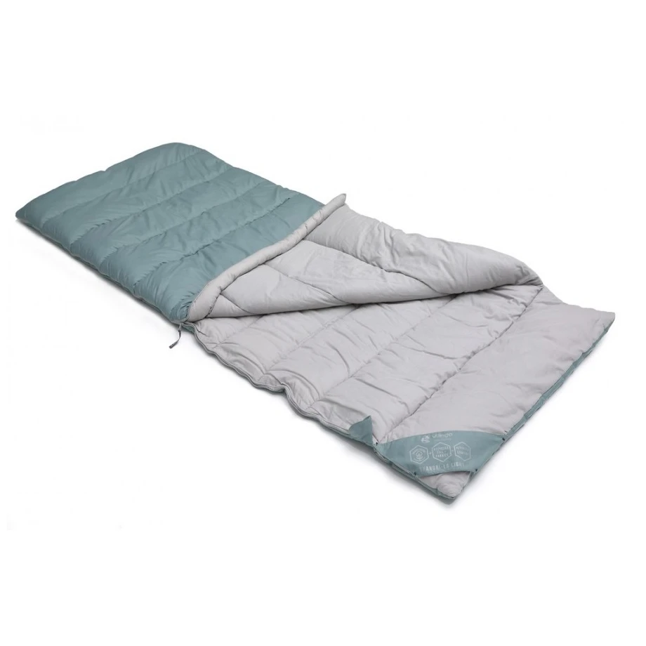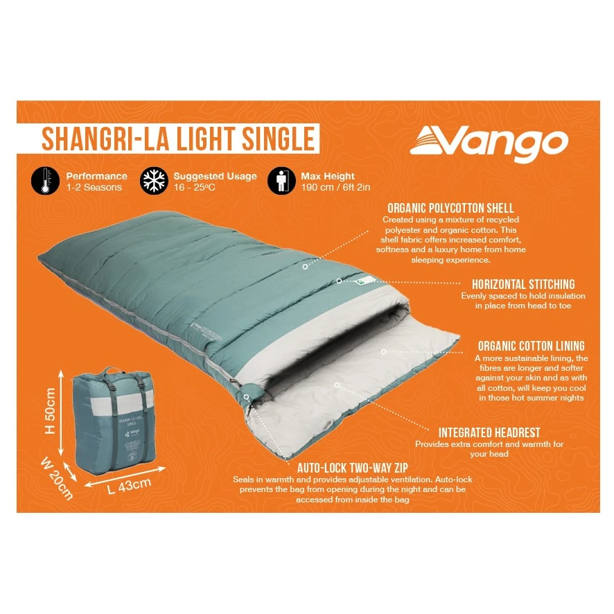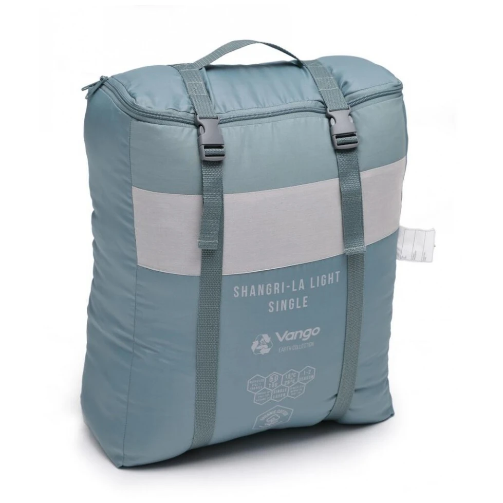 Der quadratische Einzelschlafsack Vango Shangri-La Light Single besteht aus 100% recyceltem Polyester und Bio- -Baumwolle. Er wird als 2-Jahreszeiten-Schlafsack klassifiziert.