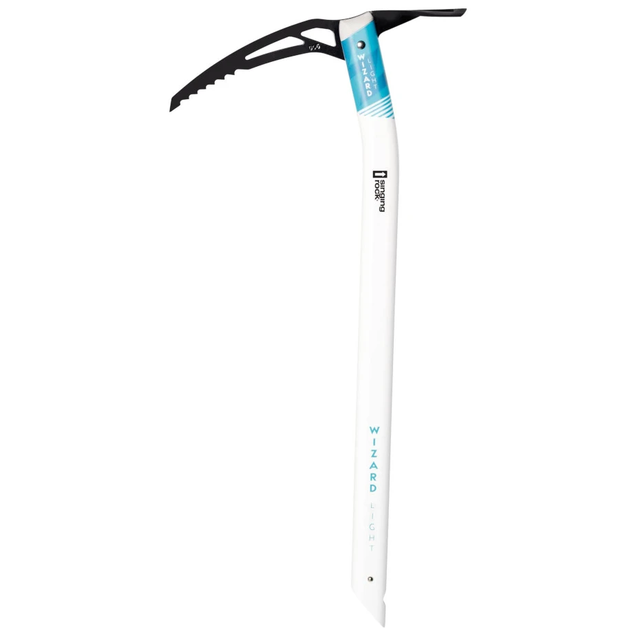 Der Wizard Light Eispickel des Herstellers Singing Rock verfügt über eine leichte Krümmung des Stiels, die beim Klettern in Eis oder Gestein mehr Freiraum bietet, während der untere Teil des Stiels leicht in den Schnee eindringt. Die Spitze besteht aus hochwertigem, gehärtetem Cr-Mo-Stahl und durchdringt problemlos harten Schnee oder Eis. Mit der Schaufel lassen sich mühelos Stufen schneiden oder Plattformen graben.