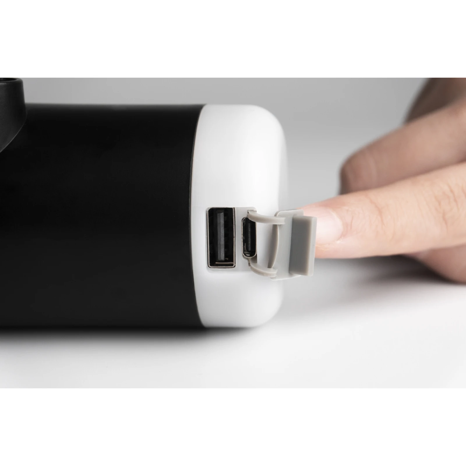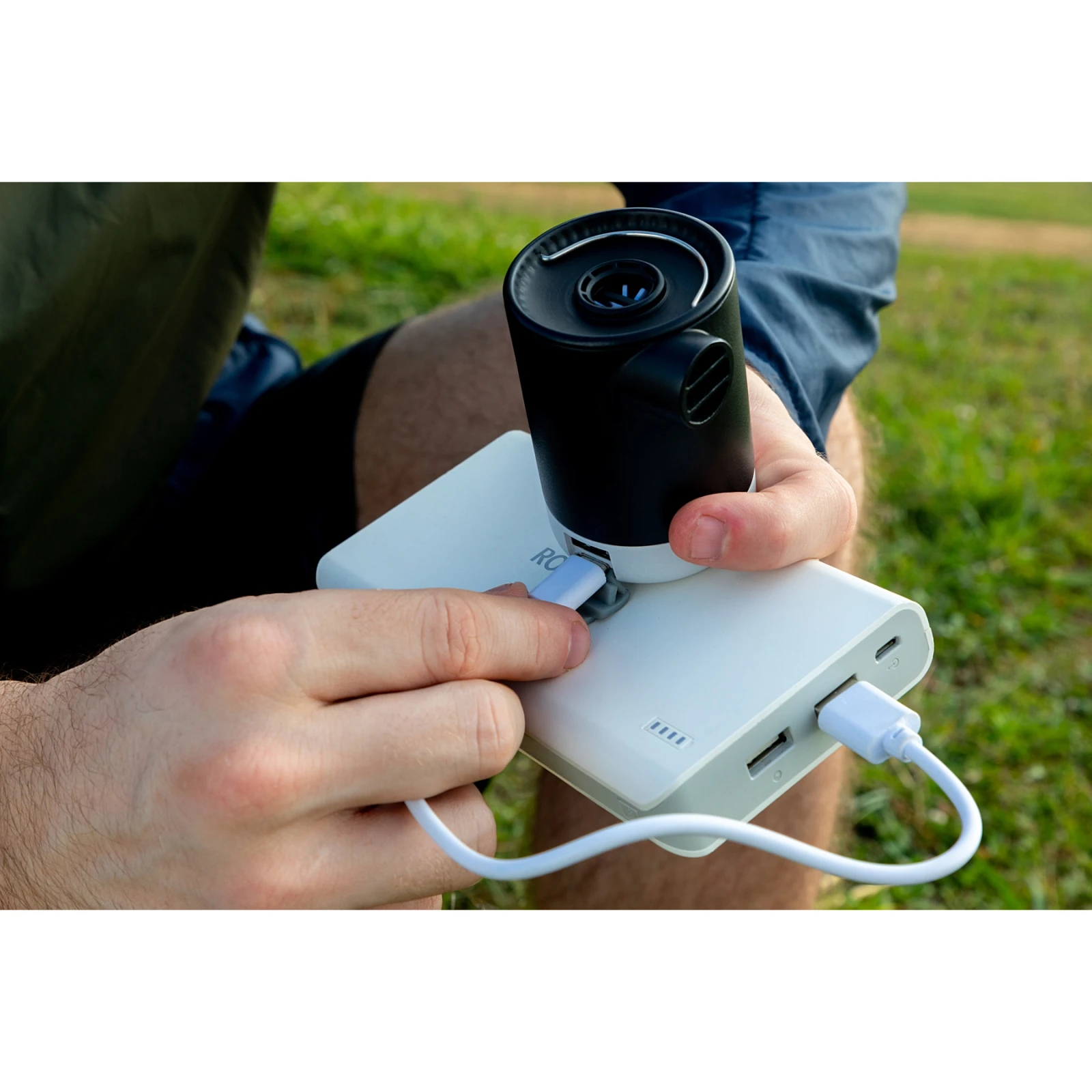 Der eingebaute 3600 mAh Lithium-Akku wird über USB-C mit Strom versorgt. Mit einer Akkuladung bläst er 6–10 kleine Boote (Packrafts), 12 Isomatten, 30 Schwimmringe auf oder hält 76 Stunden (50 lm).