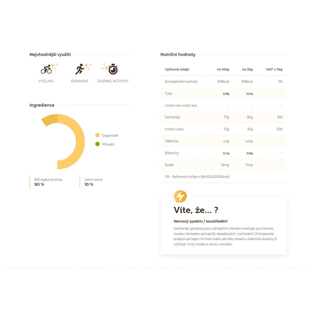 Der tschechischer Hersteller Chimpanzee mit Sitz in Brünn stellt rein natürliche Energieriegel und Getränke her. Die Produkte von Chimpanzee werden nur aus den hochwertigsten, rein natürlichen Zutaten hergestellt und erfüllen die anspruchsvollsten Anforderungen an einen aktiven und gesunden Lebensstil. Kosten Sie, lassen Sie sich von der natürlichen Energie mitreißen und vor allem - sagen Sie der Chemie Lebewohl.