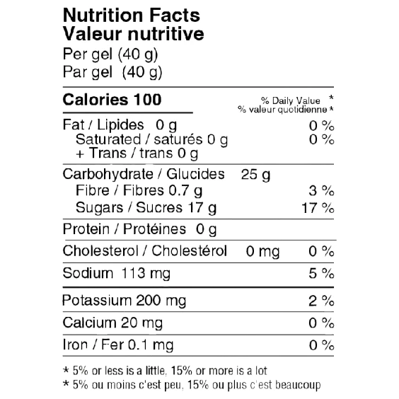 - 185 mg Elektrolyte (Natrium, Kalium) zur Ergänzung von Mineralien, die durch Schweiß verloren gehen
