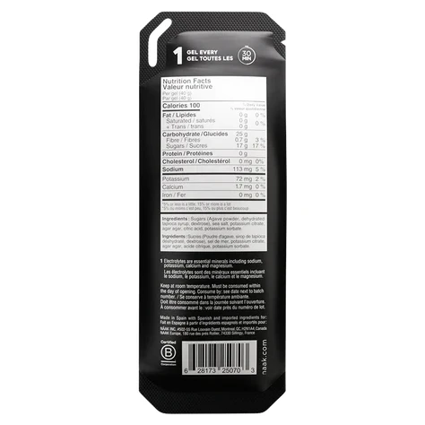 Naak Neutral Boost Energy™ Gel mit neutralem, leicht süßem Geschmack ist ideal für Sportler, die ihre Energie auffüllen möchten, ohne das Risiko einer Geschmacksüberlastung einzugehen. Jedes Gel enthält 25 g Kohlenhydrate in einem ausgewogenen Verhältnis von einfachen und komplexen Zuckern, was eine schnelle und lang anhaltende Energiezufuhr gewährleistet. Das Verhältnis von Glukose zu Fruktose von 2:1 optimiert die Zuckeraufnahme und minimiert gleichzeitig Verdauungsbeschwerden. Das Gel enthält außerdem 185 mg Elektrolyte (Natrium und Kalium) zur effektiven Wiederherstellung der durch Schweiß verlorenen Mineralien. Es wird mit Agar – einer Meeresalge – hergestellt, wodurch das Gel vegan und gelatinefrei ist, mit einer angenehmen Gelee-Konsistenz, die das Schlucken bei hoher Belastung erleichtert. Das Produkt basiert auf ökologisch nachhaltigen Rohstoffen, wie Agavensirup und Tapiokastärke, die eine nachhaltigere Alternative zu traditionellen Zuckern darstellen.