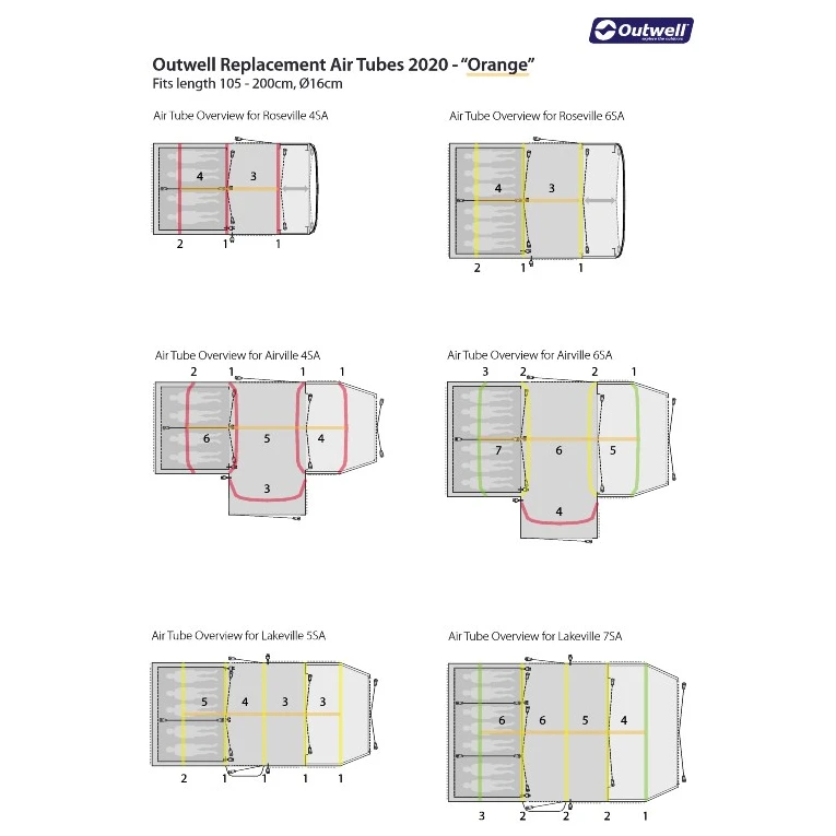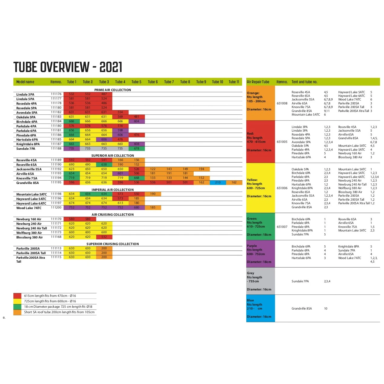 Das Air Repair - Tube Kit 1 Ersatz-Luftschlauch der dänischen Marke Outwell dient zum Ersetzen eines beschädigten Schlauchs in Ihrem aufblasbaren Zelt. Im Set enthalten sind ein Ersatzschlauch mit 1,05 – 2,00 m Länge, ein Luftventil, ein Ventilwechselwerkzeug und 2 Klebebänder. Sie wählen einfach die gewünschte Schlauchlänge aus und rollen den überschüssigen Teil einfach auf. Der Rohrinnendurchmesser beträgt 16 cm. Im folgenden Video finden Sie eine vollständige Anleitung zum Austausch. In der Galerie wird dann die Position des Luftschlauchs angezeigt, in diesem Fall orange markiert.