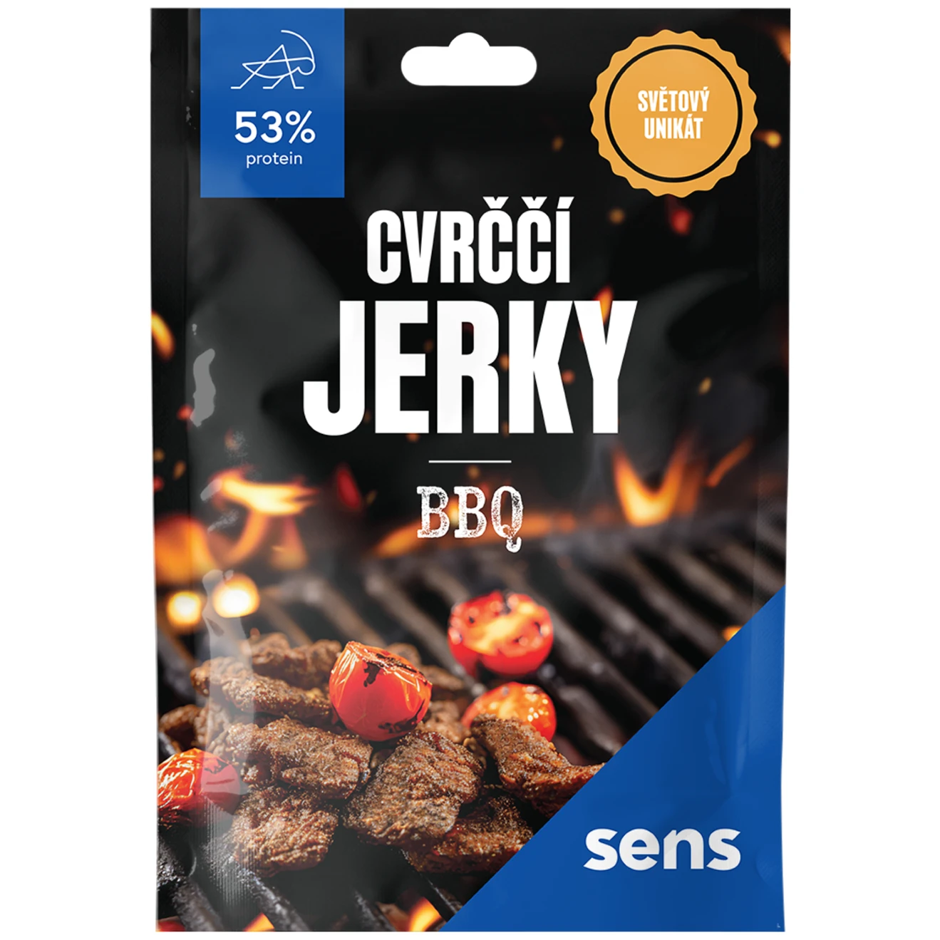 Getrocknete Stücke von Sens Jerky mit BBQ-Geschmack. Zutaten: Sens Trockenfleisch 61 % (Grillen- -Protein (Acheta Domesticus) (45 %), Soja- -Proteinisolat, Weizen- -Gluten), fermentierter Alkoholessig, Feuchthaltemittel: Glycerin, getrocknete Zwiebeln, Rapsöl, getrocknete Pflaumen (Pflaumen 99 %, Konservierungsmittel: Kaliumsorbat, Sonnenblumenöl), natürliches Aroma, getrocknetes Tomatenpulver, Zucker, Meersalz, Reismehl, Hefeextrakt, Gewürzmischung.