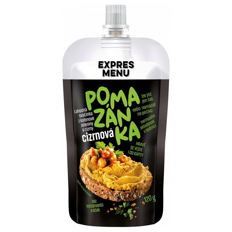 Ein leckerer Snack aus Wurzelgemüse und Kichererbsen vom Hersteller Expres Menu, der pur oder als Brotaufstrich gegessen werden kann. Sie müssen es nicht im Kühlschrank aufbewahren und es passt problemlos in Ihre Tasche.