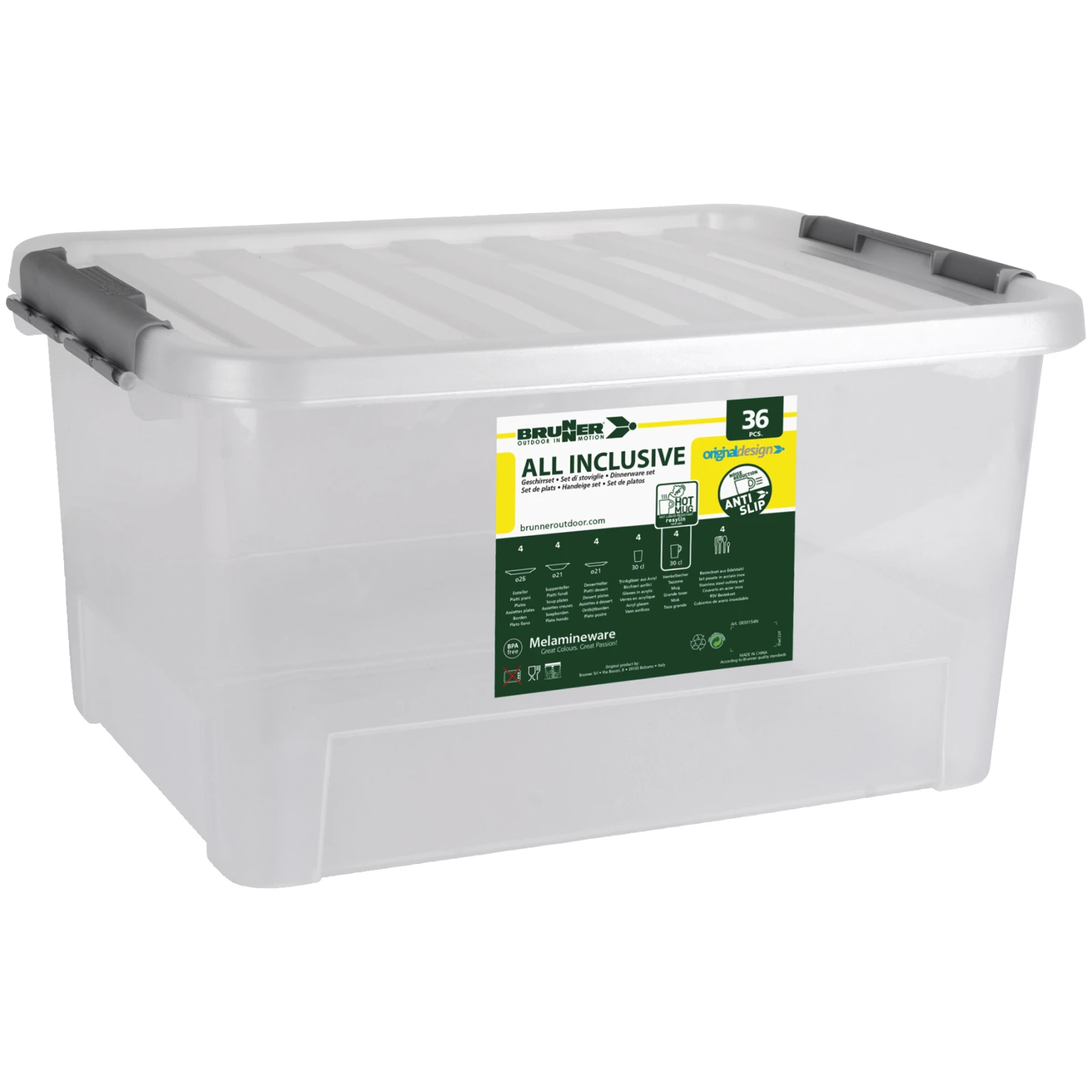 Das Dolomit All Inclusive Kochgeschirr-Set der Marke Brunner beinhaltet eine komplette Campingausstattung. Das Set besteht aus 36 Tafel- und Besteckteilen und ist für 4 Personen geeignet. Beim Camping werden Sie die erhöhte Haltbarkeit dank Melaminsicherlich zu schätzen wissen. Dieses Material ist schlagfest, leicht zu reinigen, hitze- und feuchtigkeitsbeständig, geruchs- und geschmacksneutral sowie umweltfreundlich. Geschirr kann in den Gefrierschrank und die Spülmaschine gestellt werden.