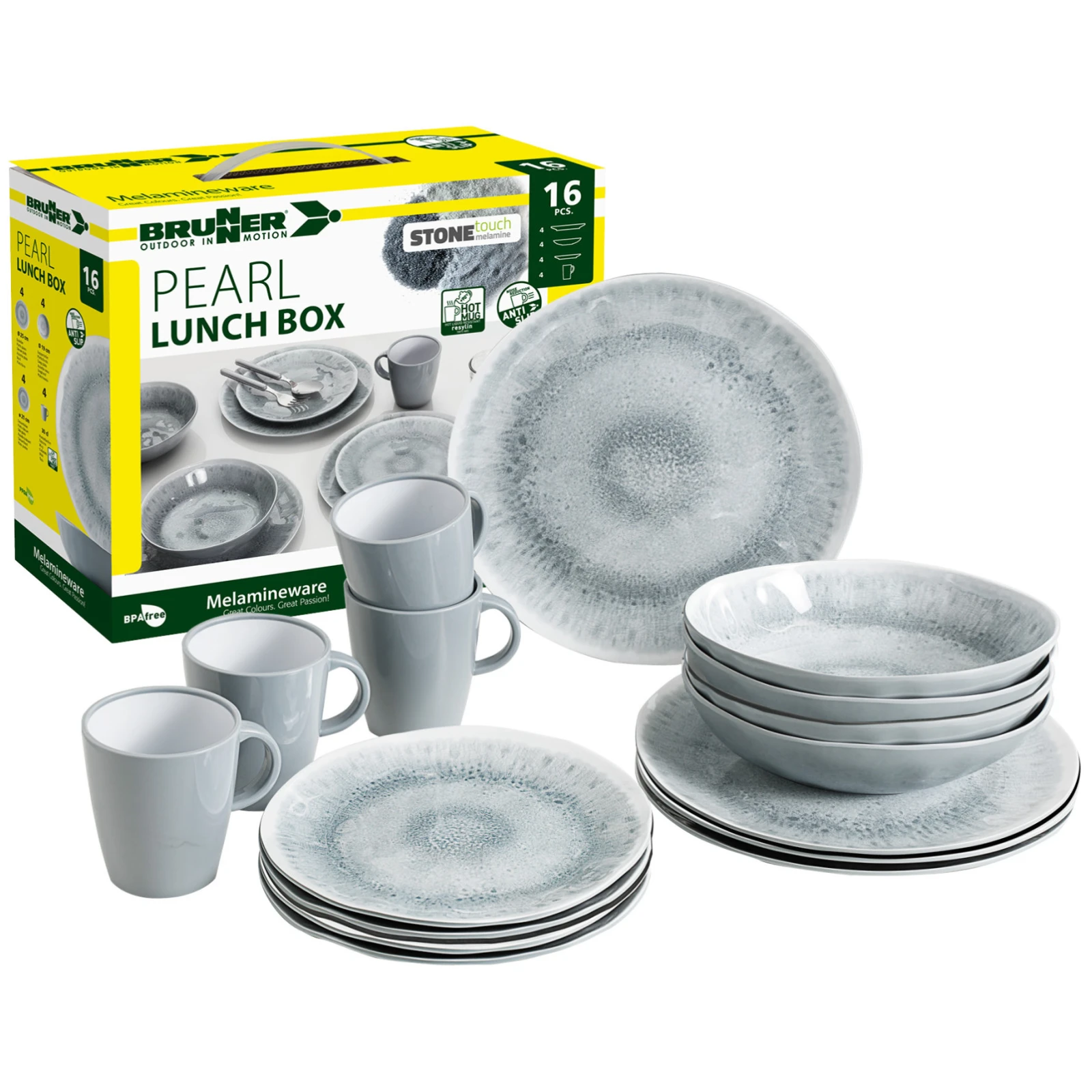 Brunner Lunch Box Pearl ist ein praktisches Melamingeschirrset mit Anti-Rutsch-Beschichtung. Leicht, langlebig und ideal für Camping, Reisen und Mahlzeiten im Freien.