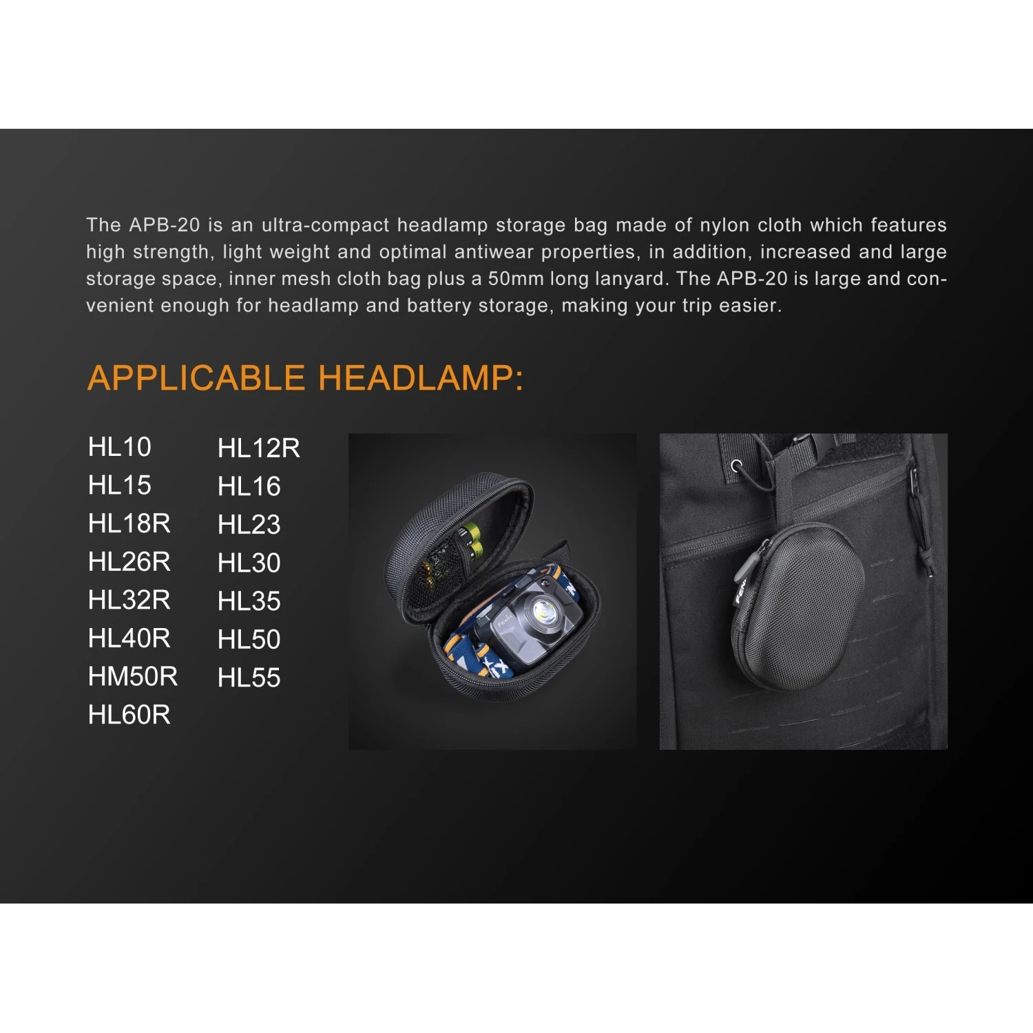 Universal- Etui Fenix APB-20 für Stirnlampen Fenix. Die Hülle besteht aus Nylongewebe, das zugleich leicht und verschleißfest ist. Es verfügt außerdem über eine Innentasche für Ersatzbatterien und eine 50 mm lange Aufhängeschlaufe.