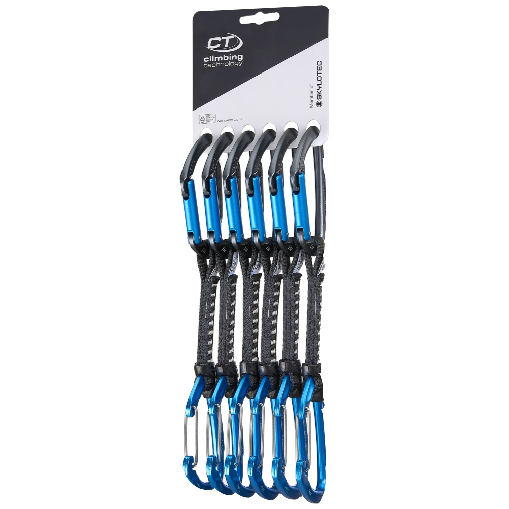 Ein Set aus sechs klassischen, vielseitig einsetzbaren kurzen Expressschlingen Lime-M Set 12 cm DY 6-tlg. der italienischen Marke Climbing Technology mit einer leichten und äußerst strapazierfähigen vernähten Schlaufe aus Dyneema-Material mit hervorragendem Preis-Leistungs-Verhältnis. Robuste, leichte Expressen – ideal zum Sportklettern und Onsight-Klettern.