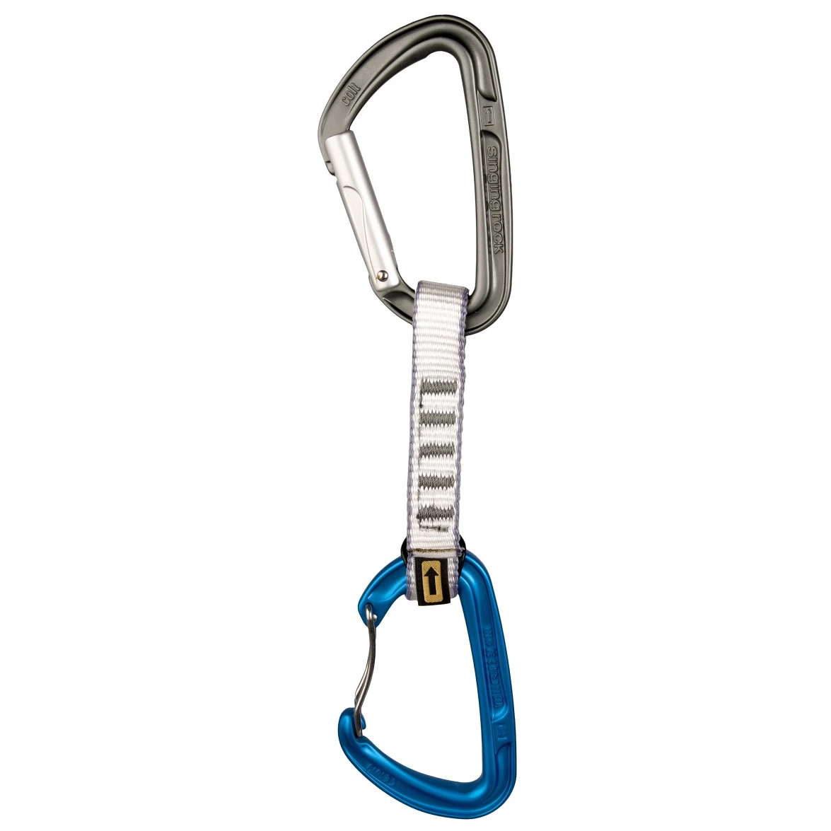 Der untere robuste, heißgeschmiedete Karabiner verfügt über ein gerades Drahtschloss, das ein ungewolltes Öffnen des Karabiners verhindert und auch bei winterlichen Bedingungen nicht einfriert. Der obere Keylock-Karabiner aus Duraluminium verfügt über ein durchgehend gerades Schloss mit speziell geformten Rillen zum einfachen Einrasten des Karabiners in den Niet und wieder heraus.