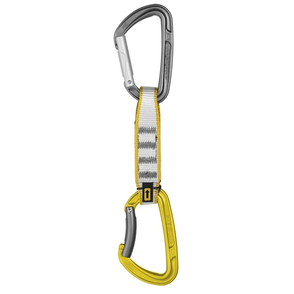 Verbunden sind die Karabiner durch eine 16 mm breite und 12 cm lange Schlaufe aus widerstandsfähigem Polyamid, wobei der untere gebogene Karabiner mit einem Gummiring ausgestattet ist, um die richtige Position zu halten und das Einrasten des Seils zu erleichtern.
