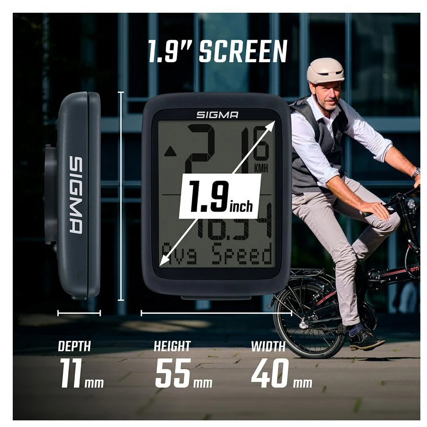 Es bietet 8 Basisfunktionen, die alle wichtigen Informationen zu all Ihren Fahrten aufzeichnen. Alle Informationen werden Ihnen auf dem großen 1,9"-Displayangezeigt, das ausreichend Platz für eine permanente Anzeige der aktuellen Geschwindigkeit und eine übersichtliche Darstellung weiterer wichtiger Funktionenbietet. Eine Übersicht über die gewählte Funktion bietet der Text am unteren Rand des Displays, sodass Sie immer genau wissen, zu welcher Funktion die Daten gehören. Ein interessantes Feature ist beispielsweise der ständige Vergleich der aktuellen und der Durchschnittsgeschwindigkeit, der Ihnen anzeigt, ob Sie schneller oder langsamer als Ihre Durchschnittsgeschwindigkeit fahren. Das auch bei Sonnenlicht gut lesbare Display wird durch eine große Taste ergänzt, was eine sichere Bedienung auch während der Fahrt ermöglicht. Genauere Informationen zu Ihrer Fahrt erhalten Sie durch vordefinierte Reifengrößen (vom kleinen Kinderfahrrad bis hin zu 29-Zoll-Rädern), Sie können diese aber auch millimetergenau manuell eingeben.