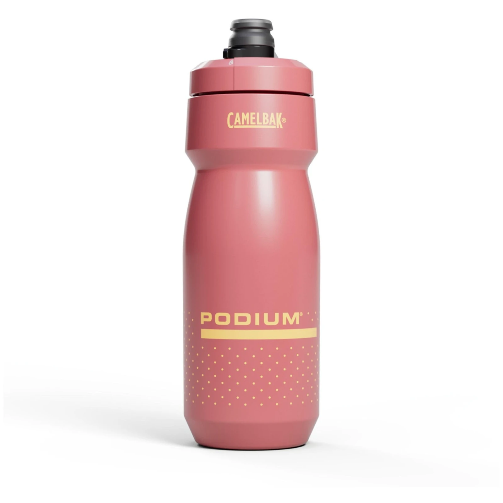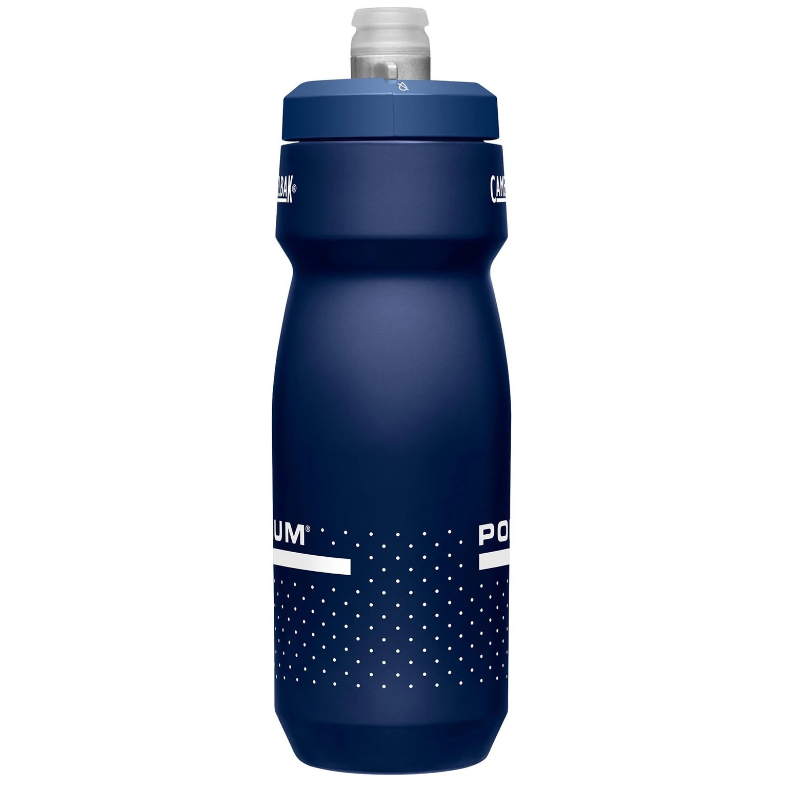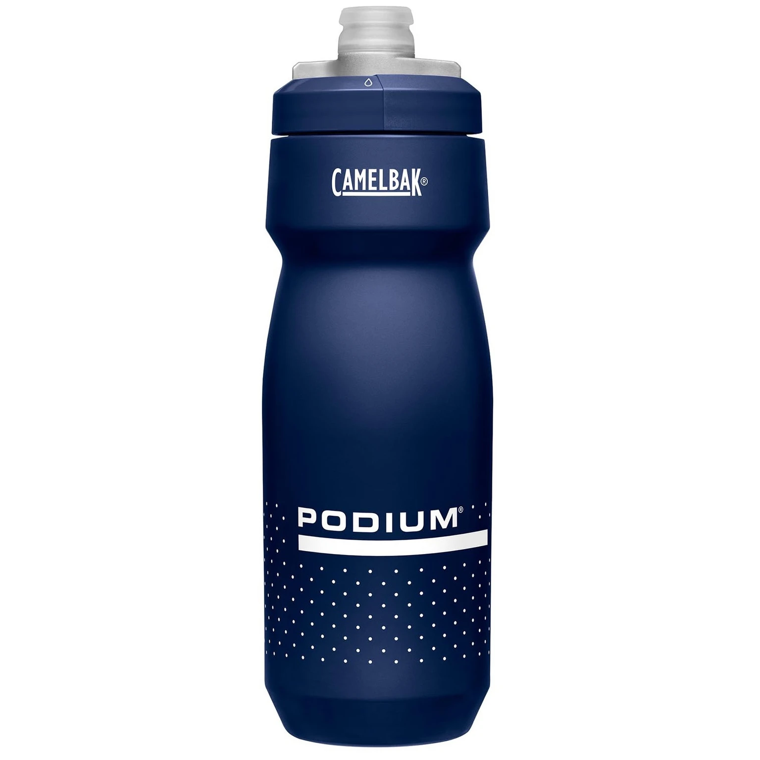 DieFahrradflasche Camelbak Podium mit einem Fassungsvermögen von 0,71 l besteht aus BPA-, BPS- und BPF-freiem TruTaste-Polypropylen mit einem (gesundheitlich unbedenklichen) Jet Valve-Mundstückaus Silikon. Dank dieser Eigenschaften gehört der Plastikgeschmack der Vergangenheit an. Das Mundstück ist kürzer und hat eine größere Öffnung (das heißt, der Flüssigkeitsdurchfluss ist größer) und es lässt sich leicht abnehmen und waschen. Dank des patentierten selbstschließenden Jet Valve-Mundstücks tropft kein Wasser aus der Flasche.
