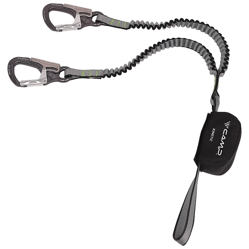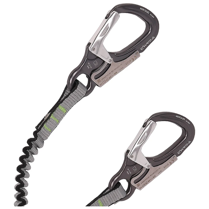 Leichtes und kompaktes Camp Kinetic Rewind-Auffanggerät mit Rip-Falldämpfer, Camp Hercules-Handflächenkarabinern und elastischen Verbindungsmittel.