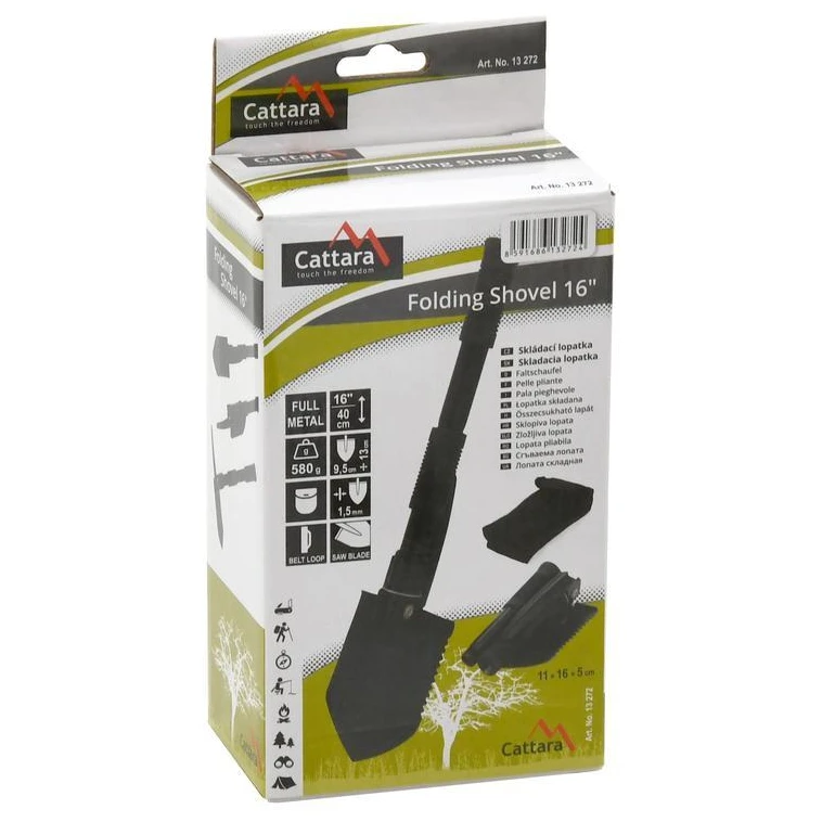 Klappspaten Metall 40cm der Marke Cattara ist praktisch und einfach zu montieren. Die Schaufel ist multifunktional einsetzbar, sie lässt sich zusammenklappen und als Hacke oder Sägeverwenden. Der Griff ist mit zwei Gummigriffen ausgestattetund sorgt so für bequemen und sicheren Halt. Wird mit einer Stoffette geliefert, die Sie einfach an Ihrem Gürtel befestigen können.