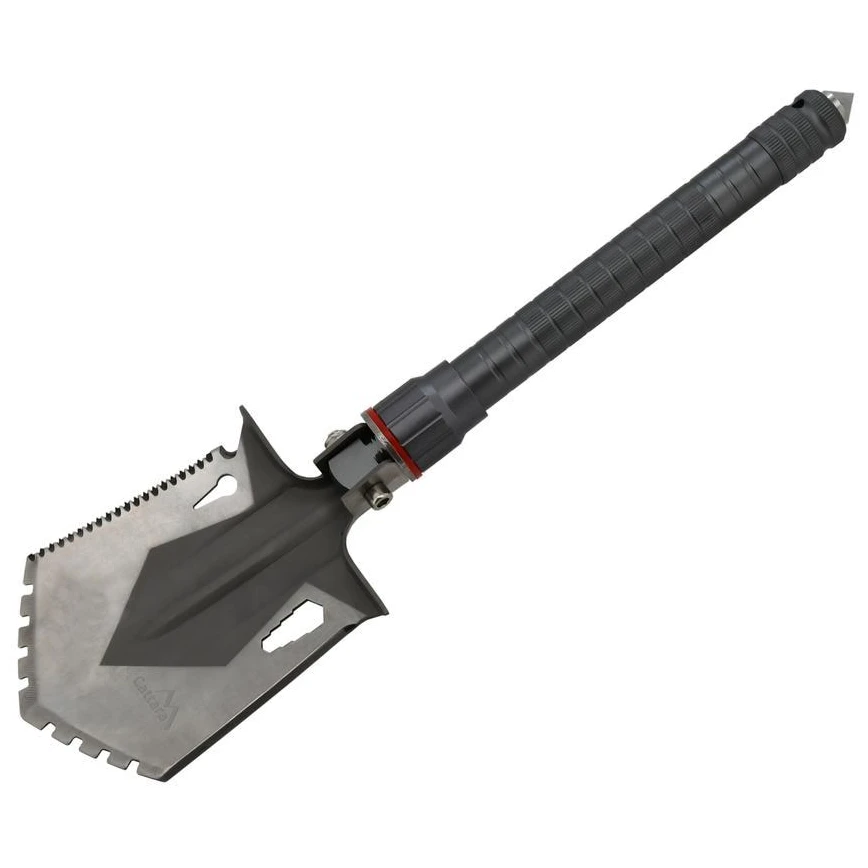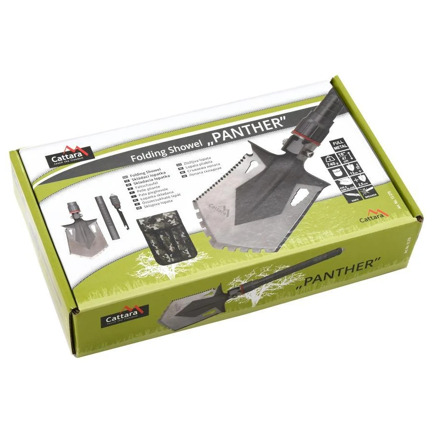 Die Klappspaten Panther 47cm der Marke Cattara ist praktisch und einfach zusammenzubauen. Die Schaufel ist multifunktional einsetzbar und beinhaltet zusätzlich kleines praktisches Zubehör, wie ein Messer mit Säge und einen Flaschenöffner. Ein Speer mit einer Spitze zum Fenstereinschlagen im Notfallist ebenfalls eine gute Idee. Die Schaufel lässt sich zusammenklappen und als Hacke oder Säge verwenden, das Blatt ist aber auch mit einem Universalschlüssel und einem Nagelzieher ausgestattet. Der Griff ist außerdem mit einer Anti-Rutsch-Rändelung ausgestattet, die für bequemen und sicheren Halt sorgt. Wird mit einer Stoffetui im Camouflage-Design geliefert, die am Gürtel befestigt werden kann.