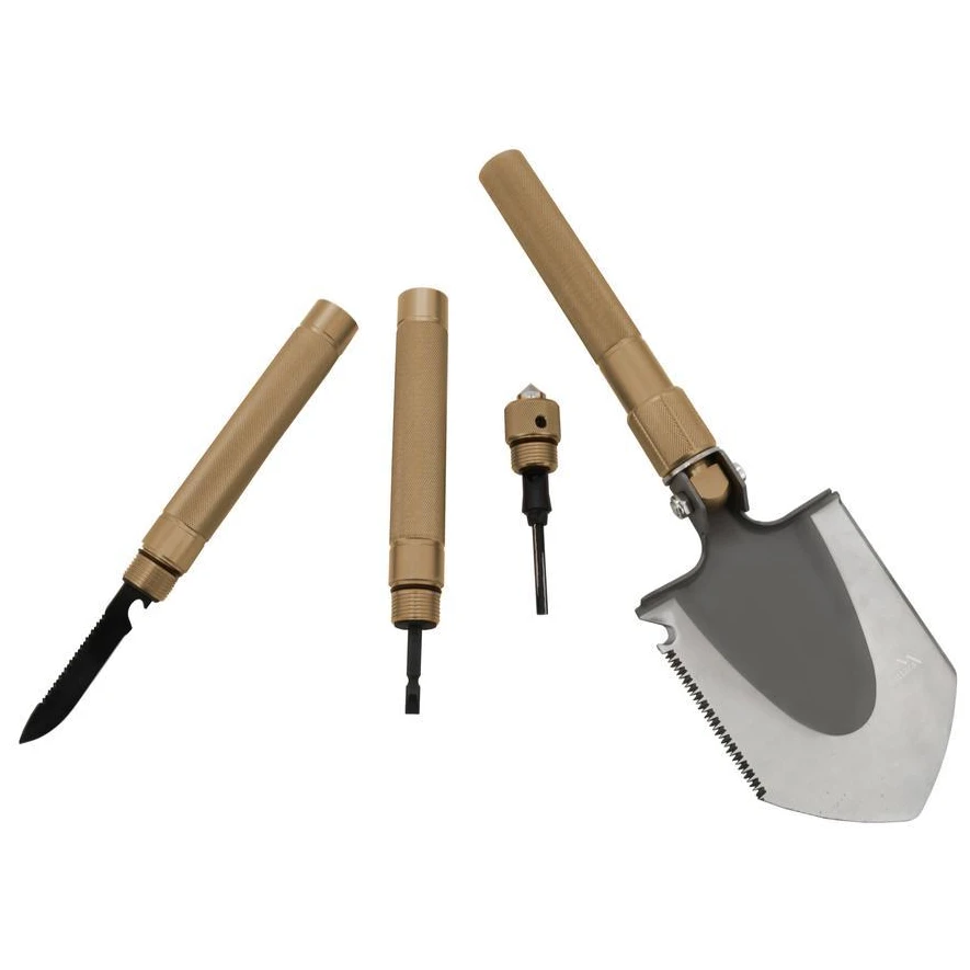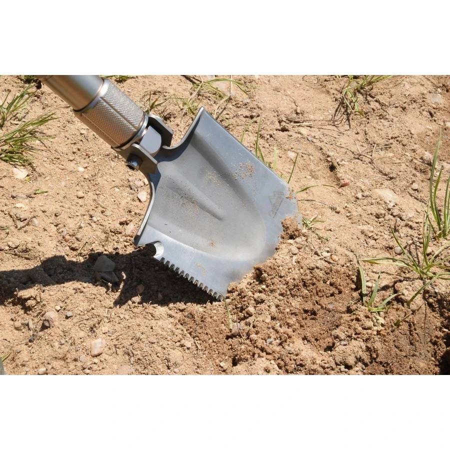 Die Klappschaufel Tiger 77cm der Marke Cattara ist praktisch und einfach zusammenzubauen. Die Schaufel ist multifunktional einsetzbar und enthält kleines praktisches Zubehör wie einen Kreuzschlitz- und Schlitzschraubendreher, ein Messer mit Säge und Dosenöffner, einen Feuerstein und eine Pfeife. Ein Speer mit einer Spitze zum Fenstereinschlagen im Notfallist ebenfalls eine gute Idee. Die Schaufel lässt sich zusammenklappen und als Hacke oder Sägeverwenden. Der Griff ist außerdem mit einer Anti-Rutsch-Rändelung ausgestattet, die für bequemen und sicheren Halt sorgt. Wird mit einer Stoffetui im Camouflage-Design geliefert, die am Gürtel befestigt werden kann.