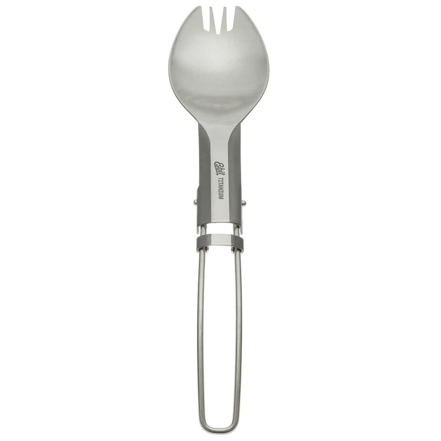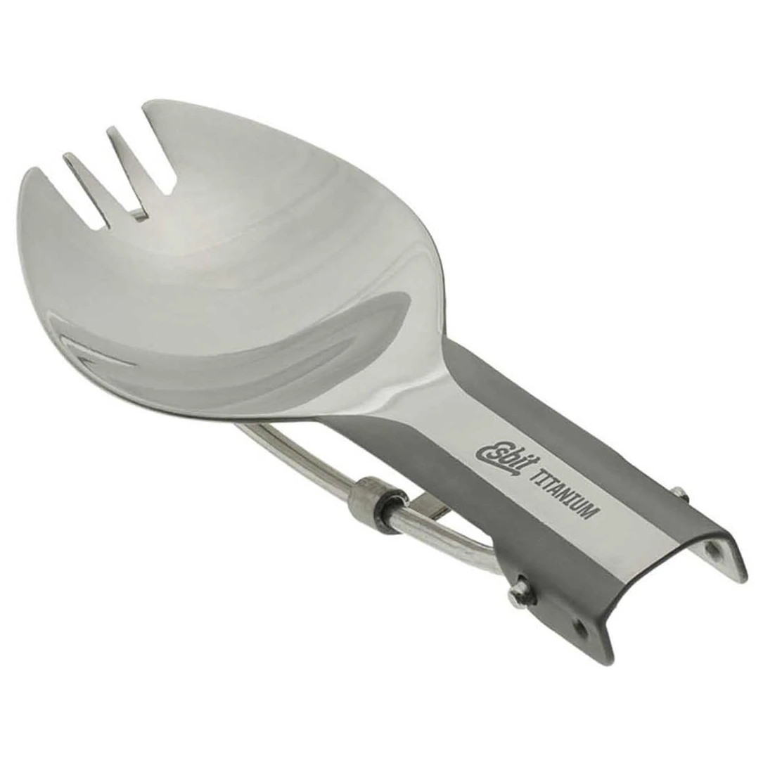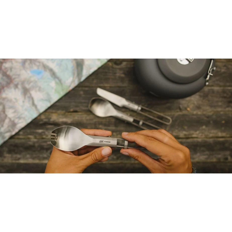 Der praktische klappbare Zackenlöffel aus Titan der Marke Esbit ist sehr kompakt und leicht. Der Griff ist faltbar, sodass er problemlos in eine Tasche oder einen Topf passt. Der in den Mund eingeführte Teil ist poliert und am Ende des Löffels befinden sich Zähne, die die Verwendung als Gabel ermöglichen. Löffel und Gabel wiegen nur 18 Gramm. Titan ist außerdem sehr korrosionsbeständig und weist ein hervorragendes Verhältnis von Gewicht zu Festigkeit auf.