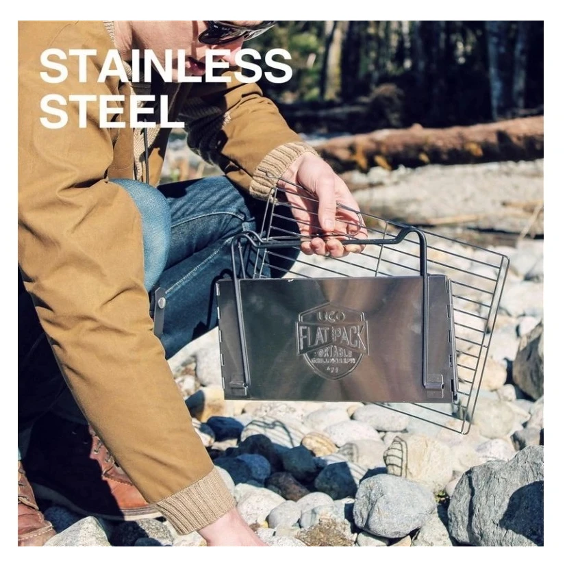 UCO Der Flatpack-Grill & Firepit ist aus rostfreiem Stahl gefertigt und bietet somit eine lange Lebensdauer und einfache Wartung. Der einfache Aufbau in 30 Sekunden, selbst für einen absoluten Laien, sorgt dafür, dass Sie es überall problemlos auf- und abbauen können.