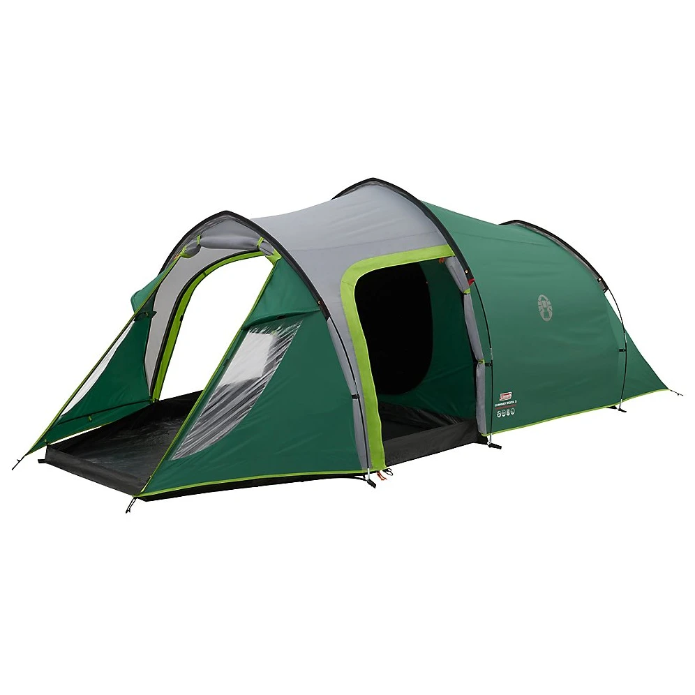 Sehr geräumiges doppelwandiges Touristenzelt für 3 Personen Chimney Rock 3 Plus der Marke Coleman. Durch die abgewinkelte Konstruktion wird die Höhe des Zeltes vergrößert und gleichzeitig die Widerstandsfähigkeit der Konstruktion gegen Wind und Regen erhöht. Das Zelt verfügt über eine geräumige Apside, die über Eingänge von zwei Seiten zugänglich ist und mit der Blackout-Technologie ausgestattet ist, die Außenlicht absorbiert, sodass Sie morgens nicht von Sonnenstrahlen geweckt werden.