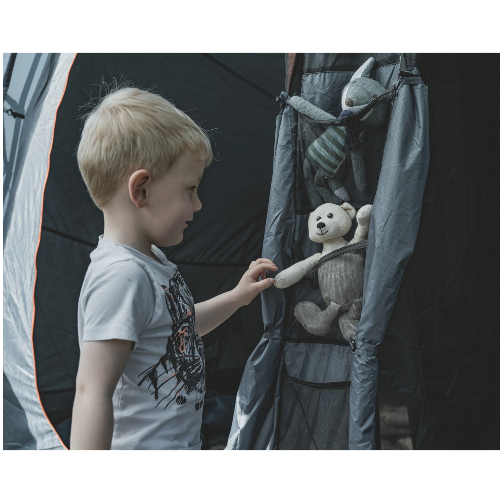 Das Zelt verfügt über einen Vorraum mit festem Boden und zwei großen Fenstern, der Platz zur Aufbewahrung von Gegenständen und für den normalen Gebrauch bietet. Wenn Sie mehr Privatsphäre wünschen, können die Fenster geschlossen werden. Zusätzliche Seitentüren mit Moskitonetzen ermöglichen eine bessere Luftzirkulation und flexiblen Zugang ins Zeltinnere. Ausreichende Höhe der Wohnfläche ermöglicht aufrechte Bewegungen. Im Inneren erwartet Sie ein verdunkelbares Schlafzimmer SleepTight, das auch tagsüber für ungestörten Schlaf sorgt. Das Schlafzimmer kann durch eine Trennwand in zwei Teile unterteilt werden.