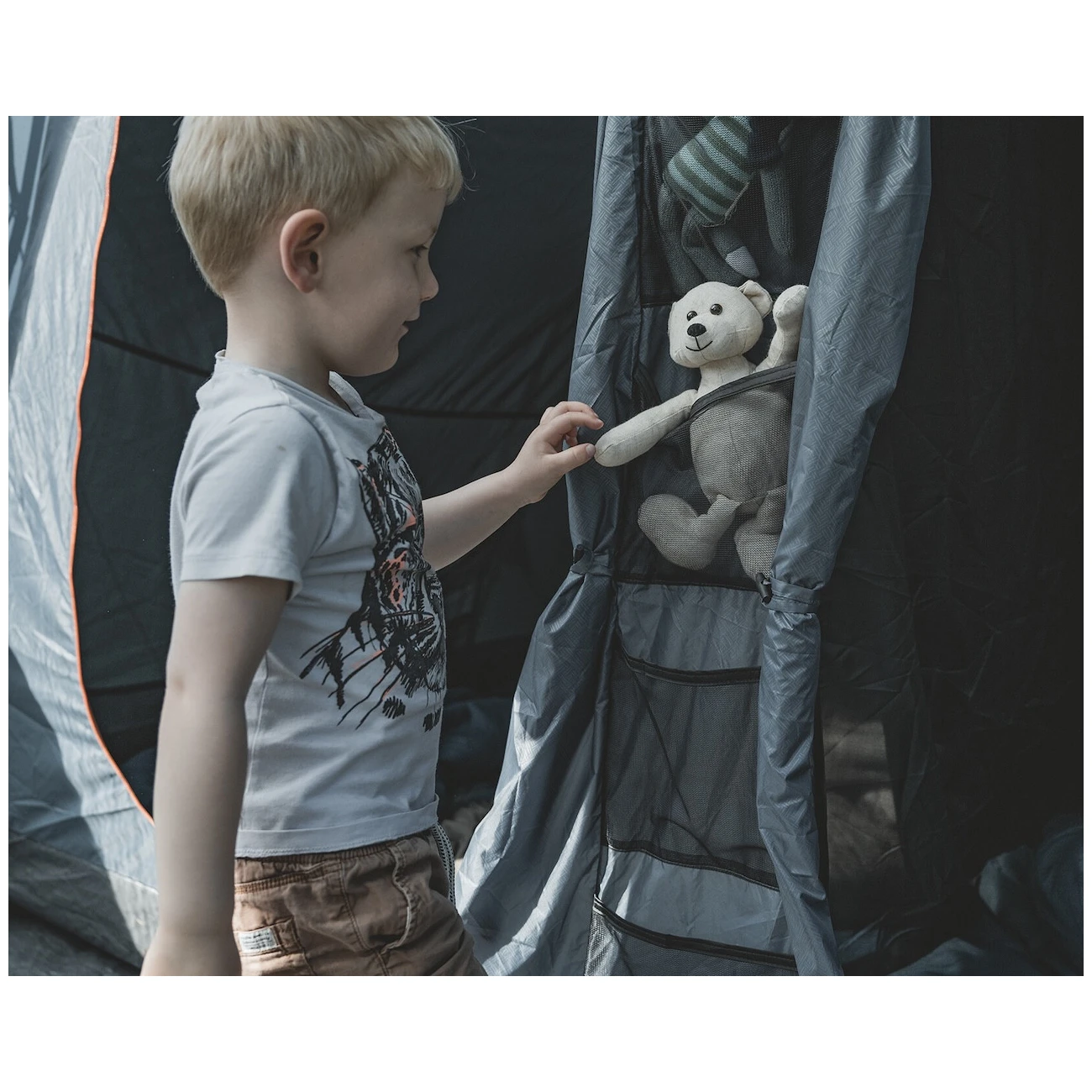 Das Zelt verfügt über einen Vorraum mit festem Boden und großen Fenstern, der Platz zur Aufbewahrung von Gegenständen und für den normalen Gebrauch bietet. Wenn Sie mehr Privatsphäre wünschen, kann das Fenster geschlossen werden. Zusätzliche Seitentüren mit Moskitonetzen ermöglichen eine bessere Luftzirkulation und flexiblen Zugang ins Zeltinnere. Vor dem Zelt befindet sich ein Vordach, so dass man auch bei Nieselregen draußen sitzen kann. Ausreichende Höhe der Wohnfläche ermöglicht aufrechte Bewegungen. Im Inneren erwartet Sie ein verdunkelbares Schlafzimmer SleepTight, das auch tagsüber für ungestörten Schlaf sorgt. Das Schlafzimmer kann durch eine Trennwand in zwei Teile unterteilt werden.