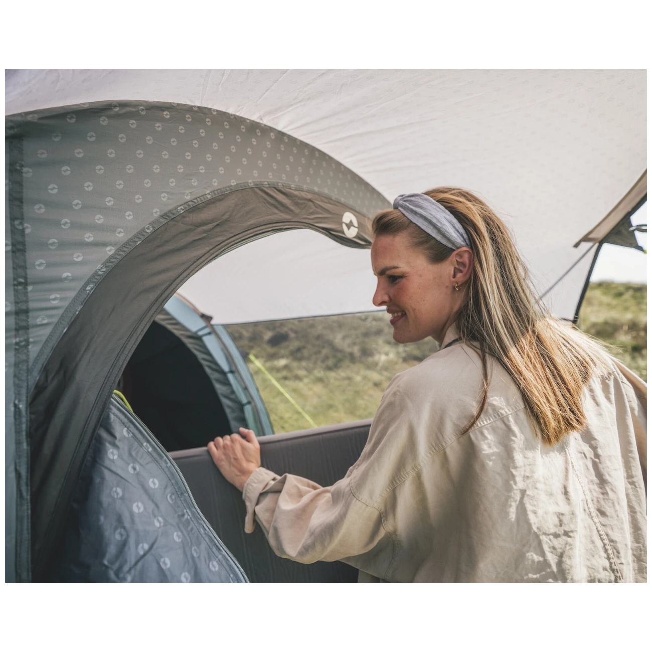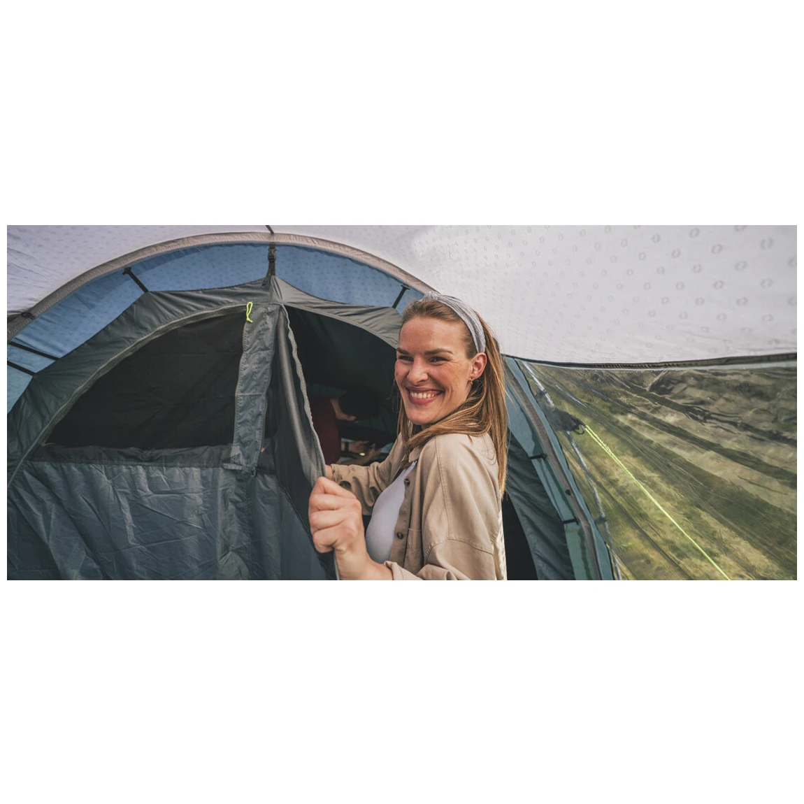 Das geräumige Familienzelt Rockwell 4 des dänischen Herstellers Outwell bietet Unterkunft für vier Personen in zwei Schlafzimmern und viel Platz im Flur und Wohnzimmer.