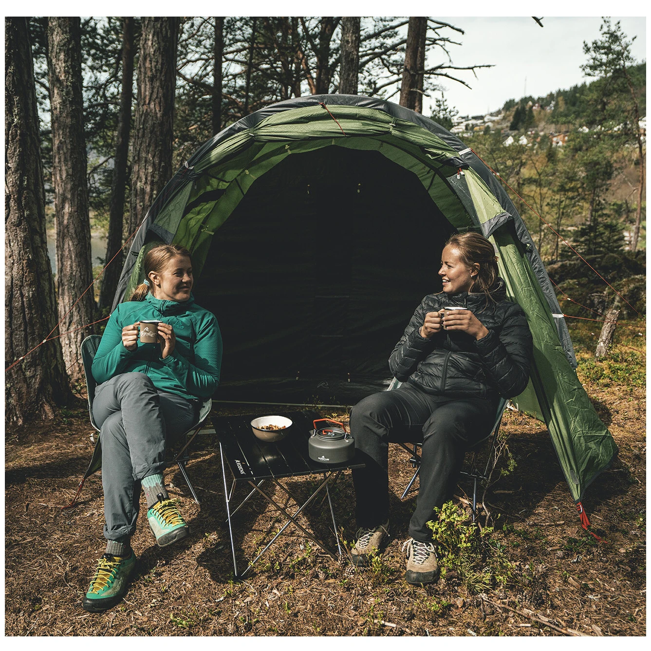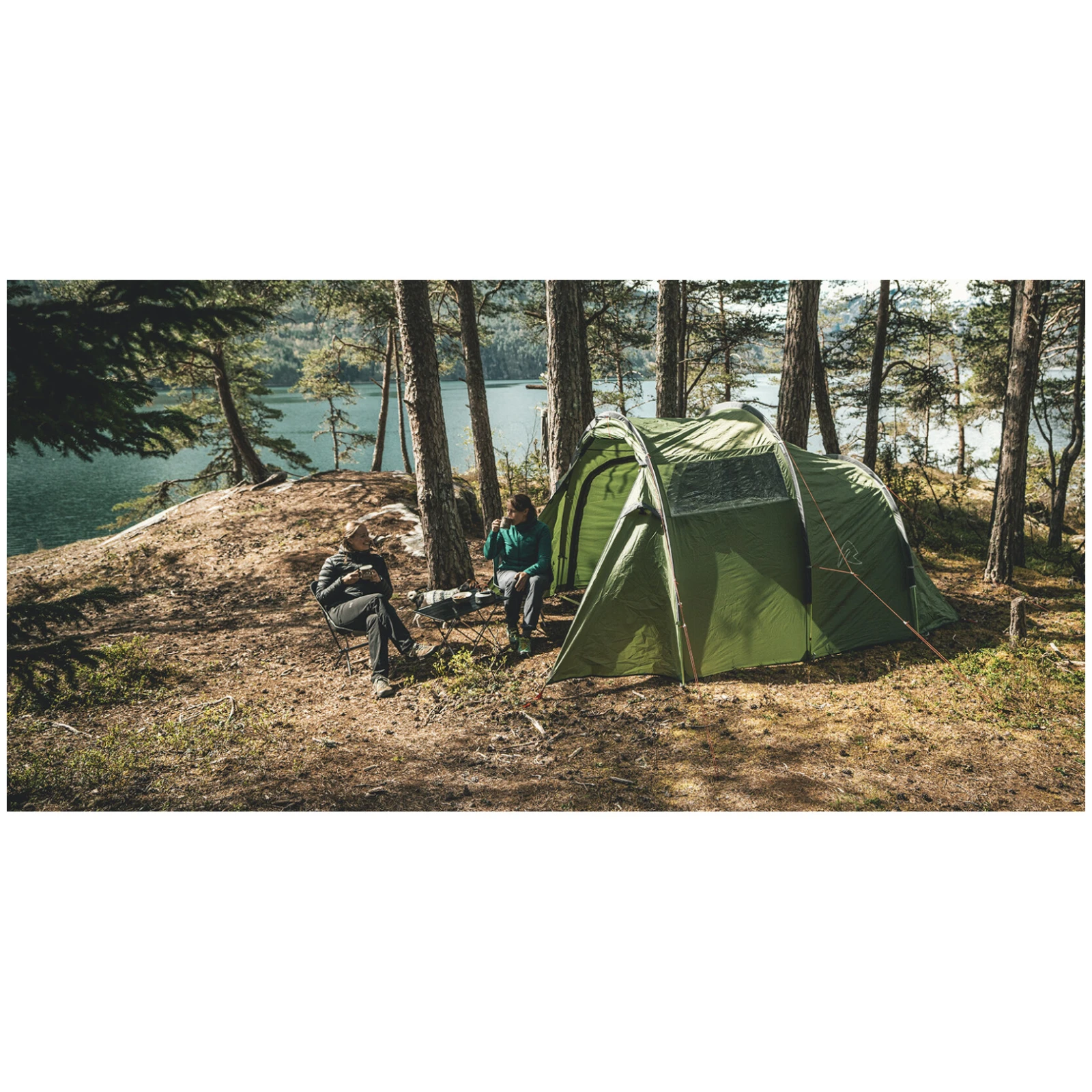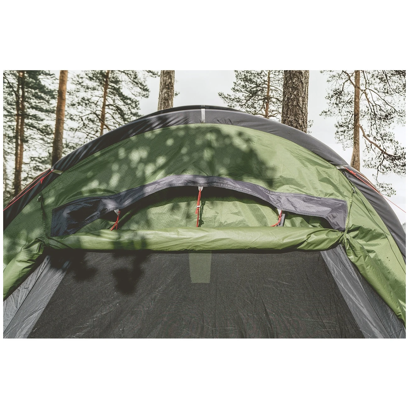 Ein großer Vorteil ist die Höhe des Zeltes, in der ein Erwachsener bequem stehenkann. Zusammen mit der großzügigen Halle steht Ihnen ein Ort in der Natur zur Verfügung, an dem Sie auch bei schlechtem Wetter gemütlich kochen, sich umziehen oder beim Abendessen sitzen können. Mit Seitentüren lässt sich der Raum noch erweitern, sodass ein Unterstandentstehen kann. Viel Licht fällt durch das breite PVC-Fenster ein, das Sie dank des Schiebevorhangsvor neugierigen Blicken schützen können.