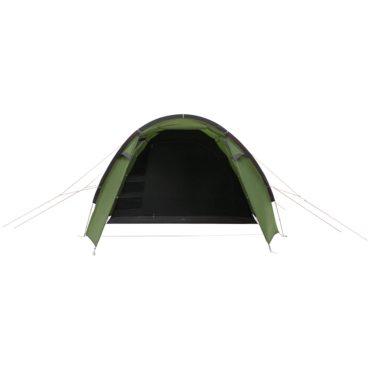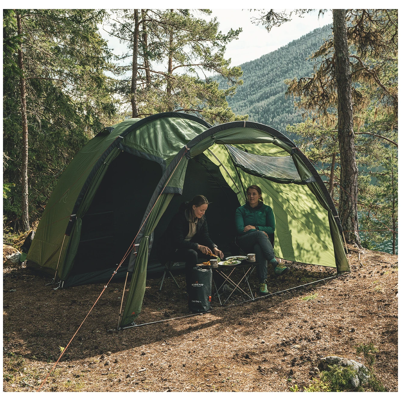 Ein großer Vorteil ist die Höhe des Zeltes, in der ein Erwachsener bequem stehen kann. Zusammen mit der großzügigen Halle steht Ihnen ein Ort in der Natur zur Verfügung, an dem Sie auch bei schlechtem Wetter gemütlich kochen, sich umziehen oder beim Abendessen sitzen können. Mit Seitentüren lässt sich der Raum noch erweitern, sodass ein Unterstand entstehen kann. Viel Licht fällt durch das breite PVC-Fenster ein, das Sie dank des Schiebevorhangs vor neugierigen Blicken schützen können.