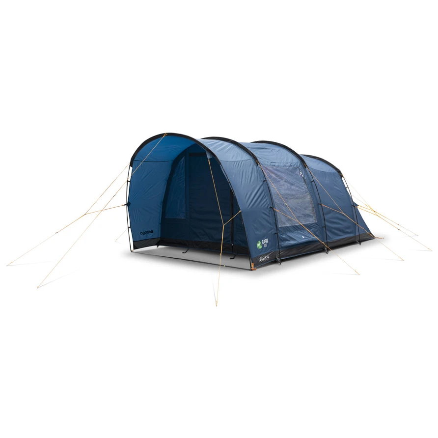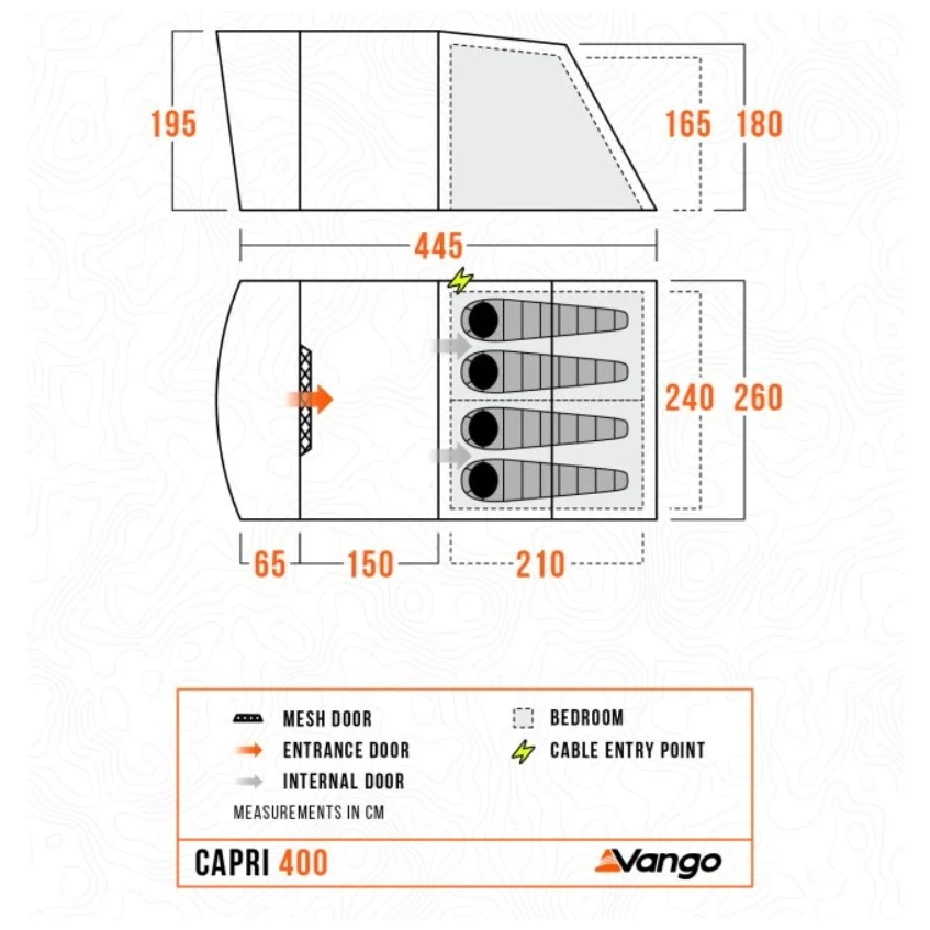 Das Familienzelt Vango Capri 400 besteht aus recyceltem Sentinel Essential-Gewebe (Wassersäule 3.000 mm), das mithilfe der ColourLok-Technologie eine erhöhte UV-Beständigkeit aufweist. Das Queensize-Schlafzimmer bietet viel Platz (60 cm pro Person), während der Flur mit Diamond Clear-Fenstern für Licht und Aussicht sorgt. Vango AirZone-Lüftungspaneele unterstützen die Luftzirkulation und reduzieren die Kondensation.