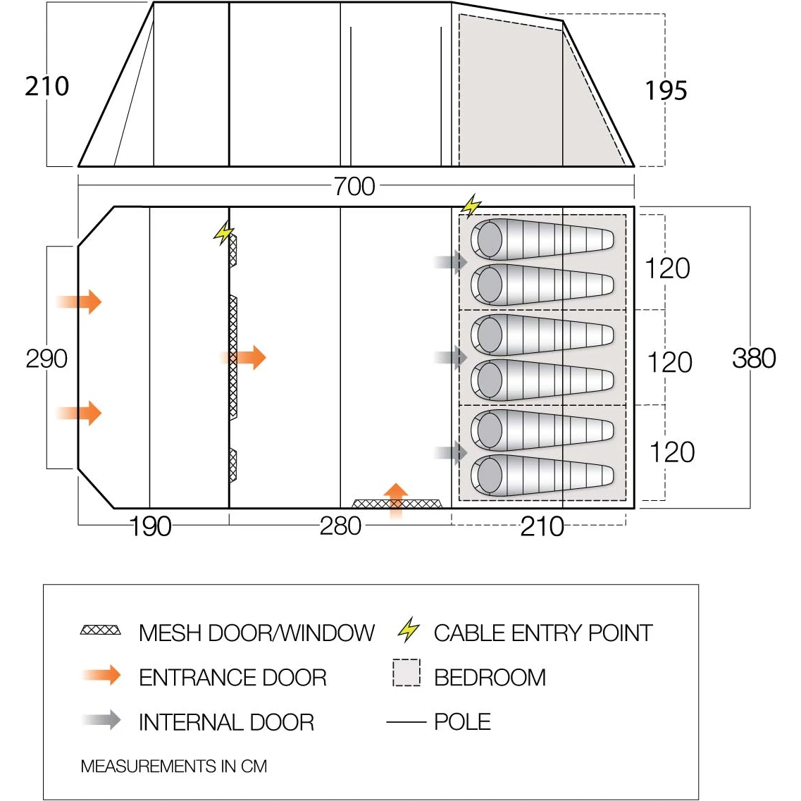 Das Zelt ist für bis zu 6 Personen geeignet und besteht aus PowerFlex®-Fibreglasstangen. Wenn wir uns das Innere des Zelts ansehen, stellen wir fest, dass es 3 Schlafzimmergibt, die getrennt werden können und aus Nightfall-Stoffbestehen, der wiederum dazu beiträgt, das Tageslicht zu blockieren . Als nächstes folgt ein zweigeteilter Wohnbereich für einen Campingtisch oder andere Möbel. Gleichzeitig finden wir in einem so großen Zelt ein Drop Down Door Step-System, also Falttüren. Der Zutritt mit Kinderwagen oder Rollstuhl ist für Sie also kein Problem.
